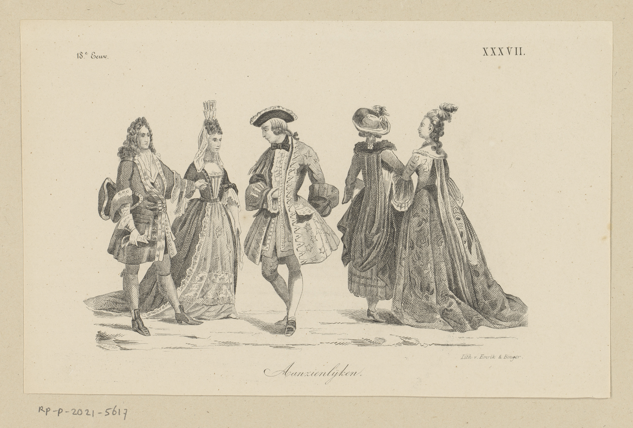 Twee vrouwen en drie mannen in kleding uit 1850, 184...