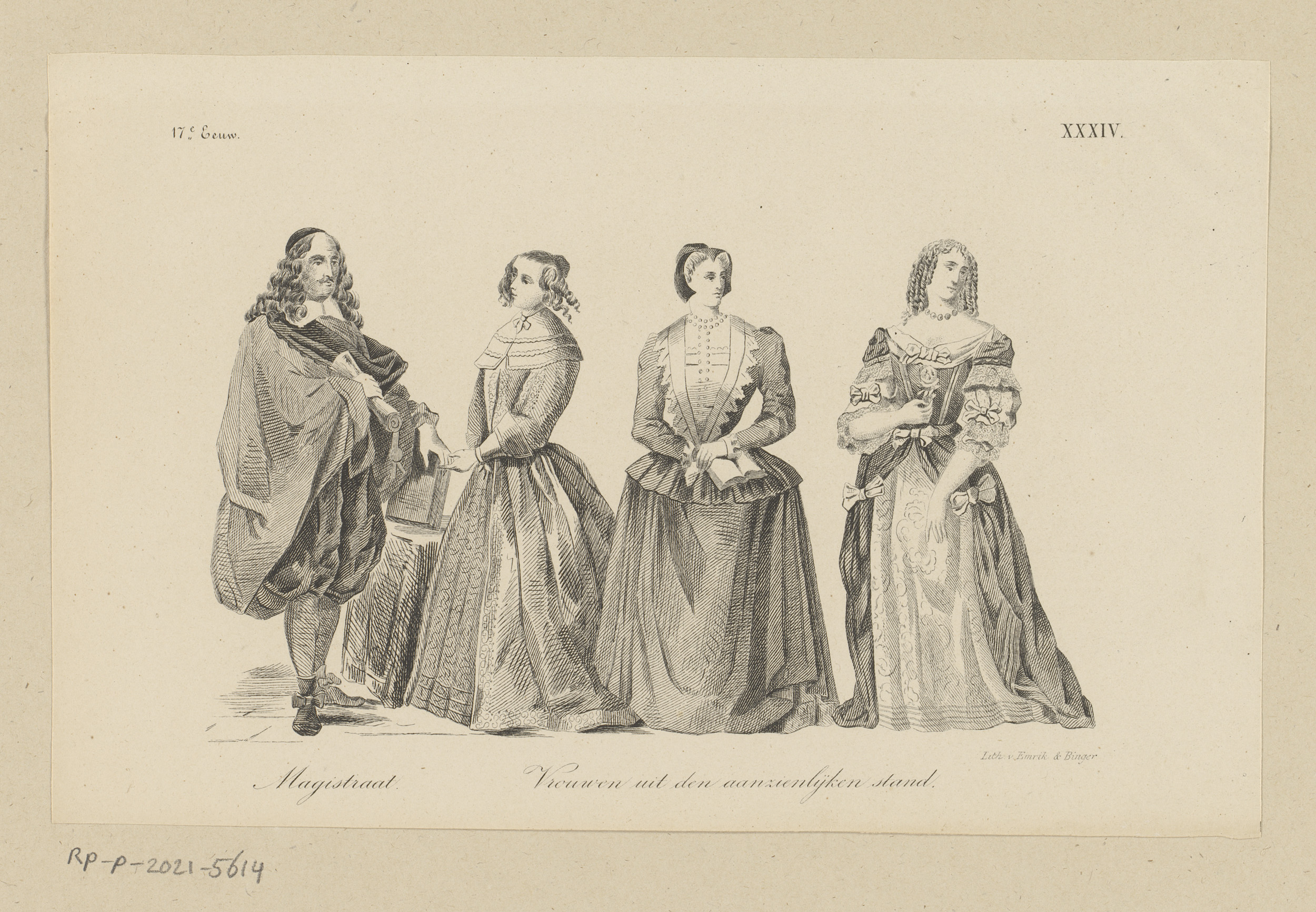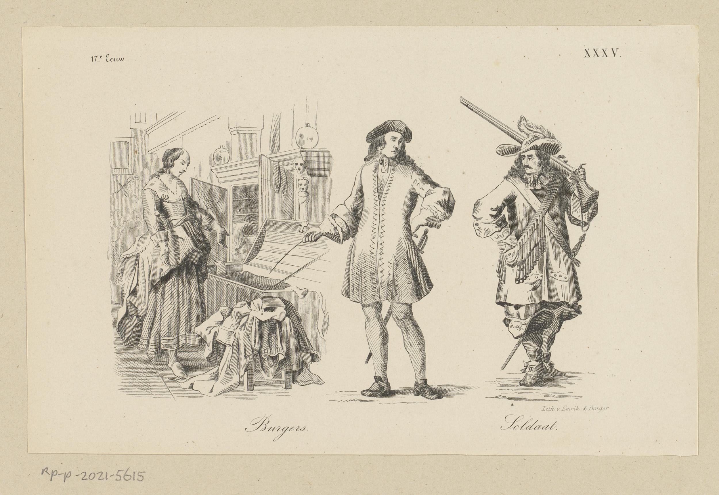 Twee burgers en soldaat in kleding uit de zeventiend...