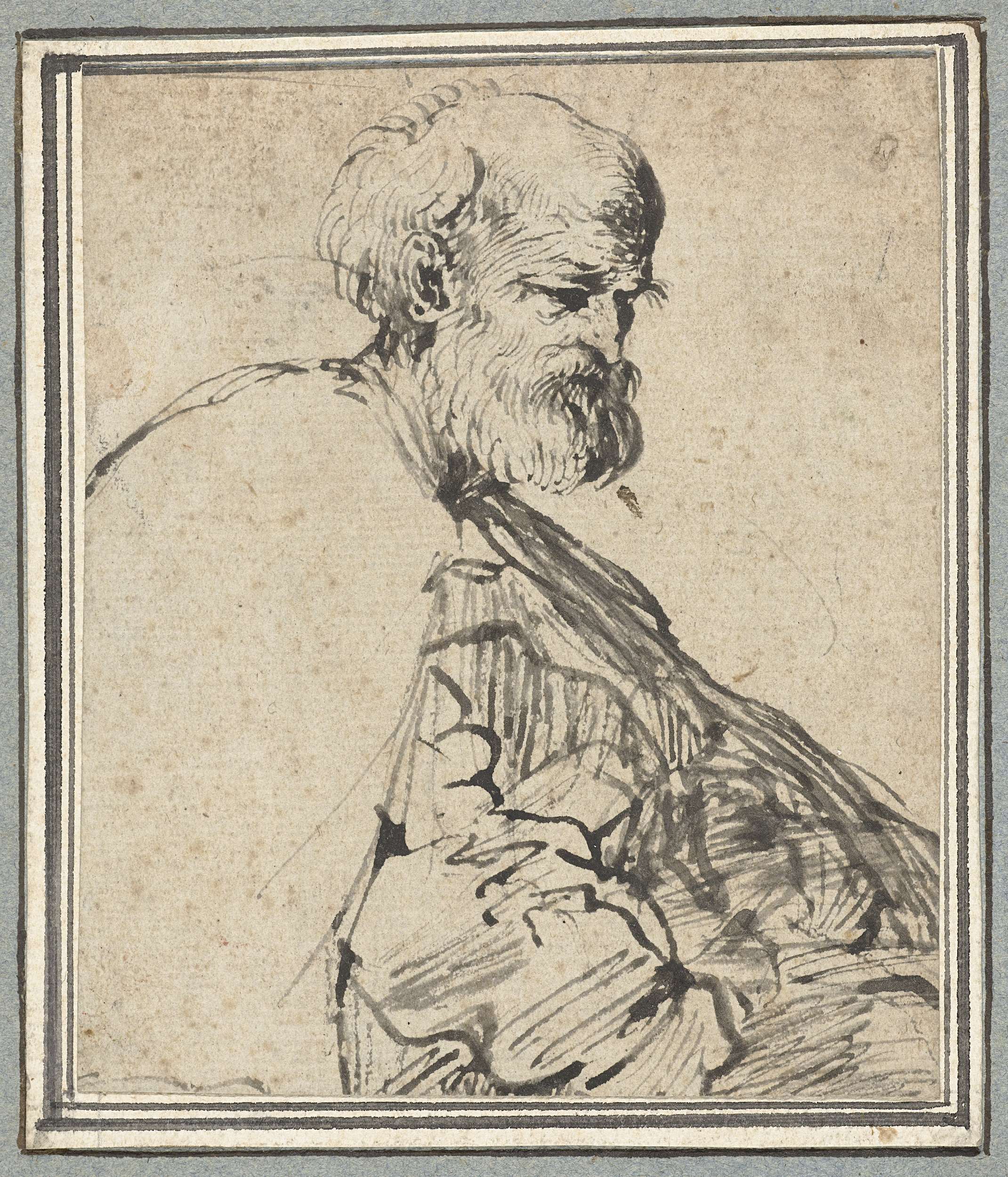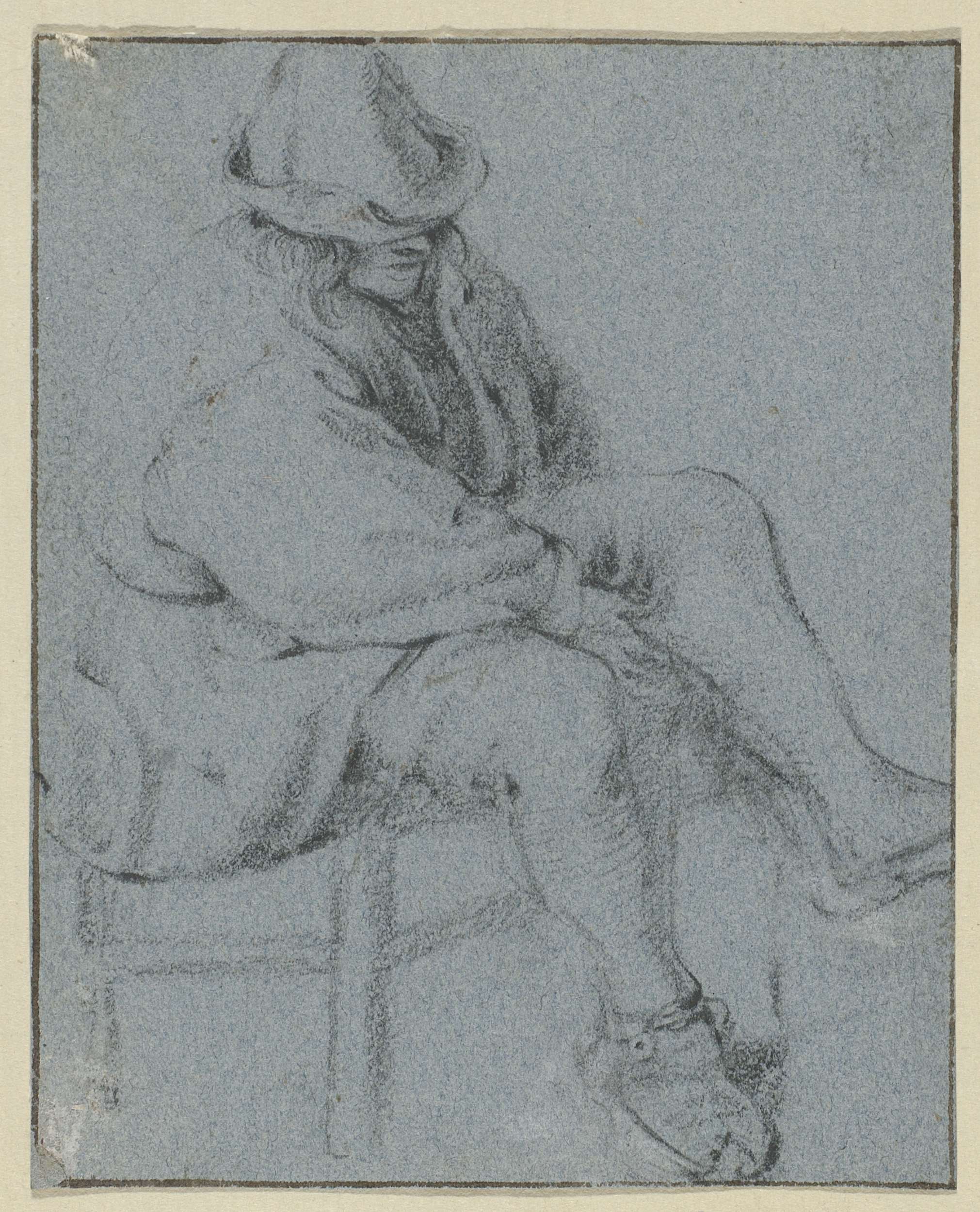 Zittende man op de rug gezien, zijn hoed in zijn han...
