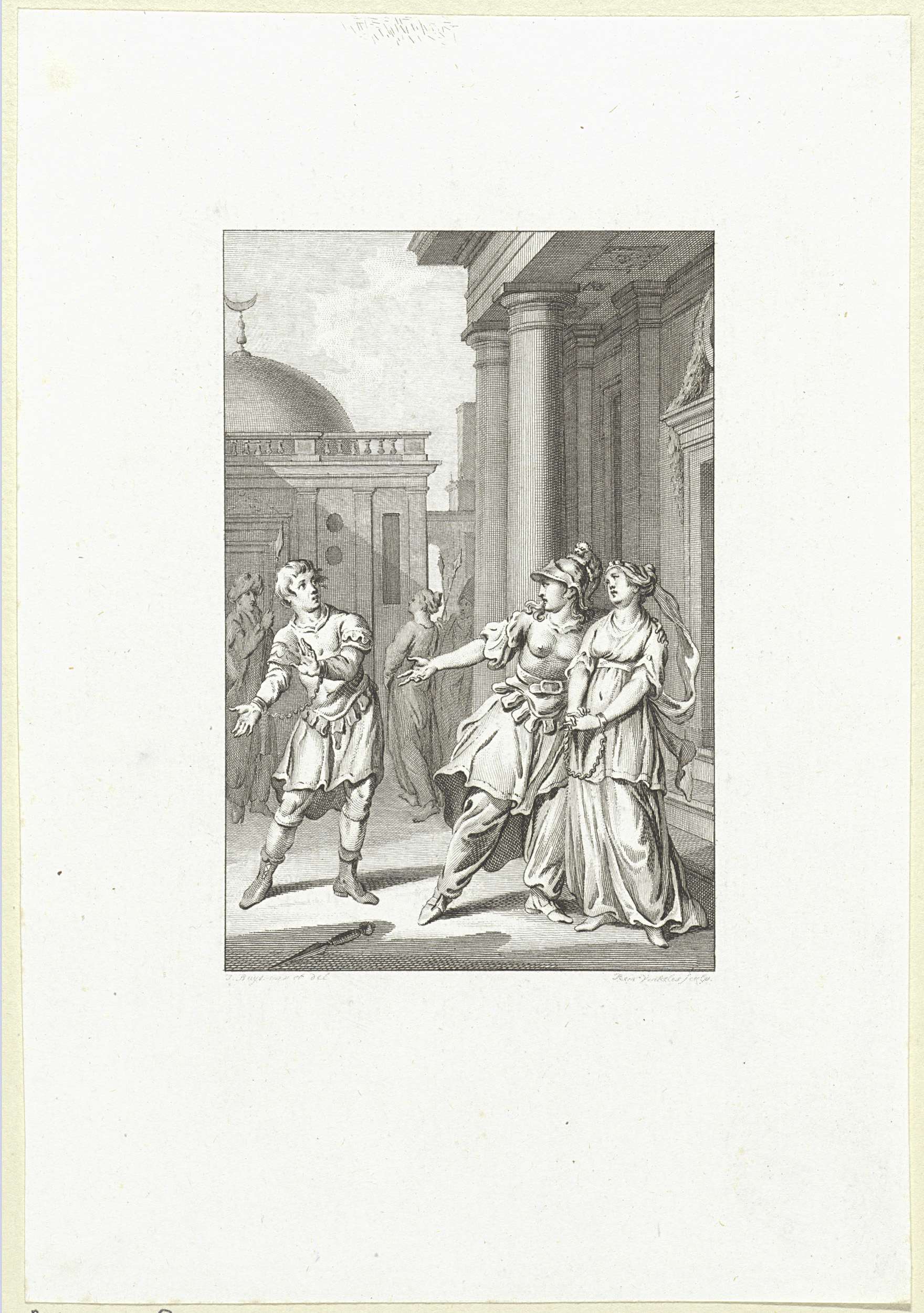 Geketend paar wordt door Clorinde toegesproken