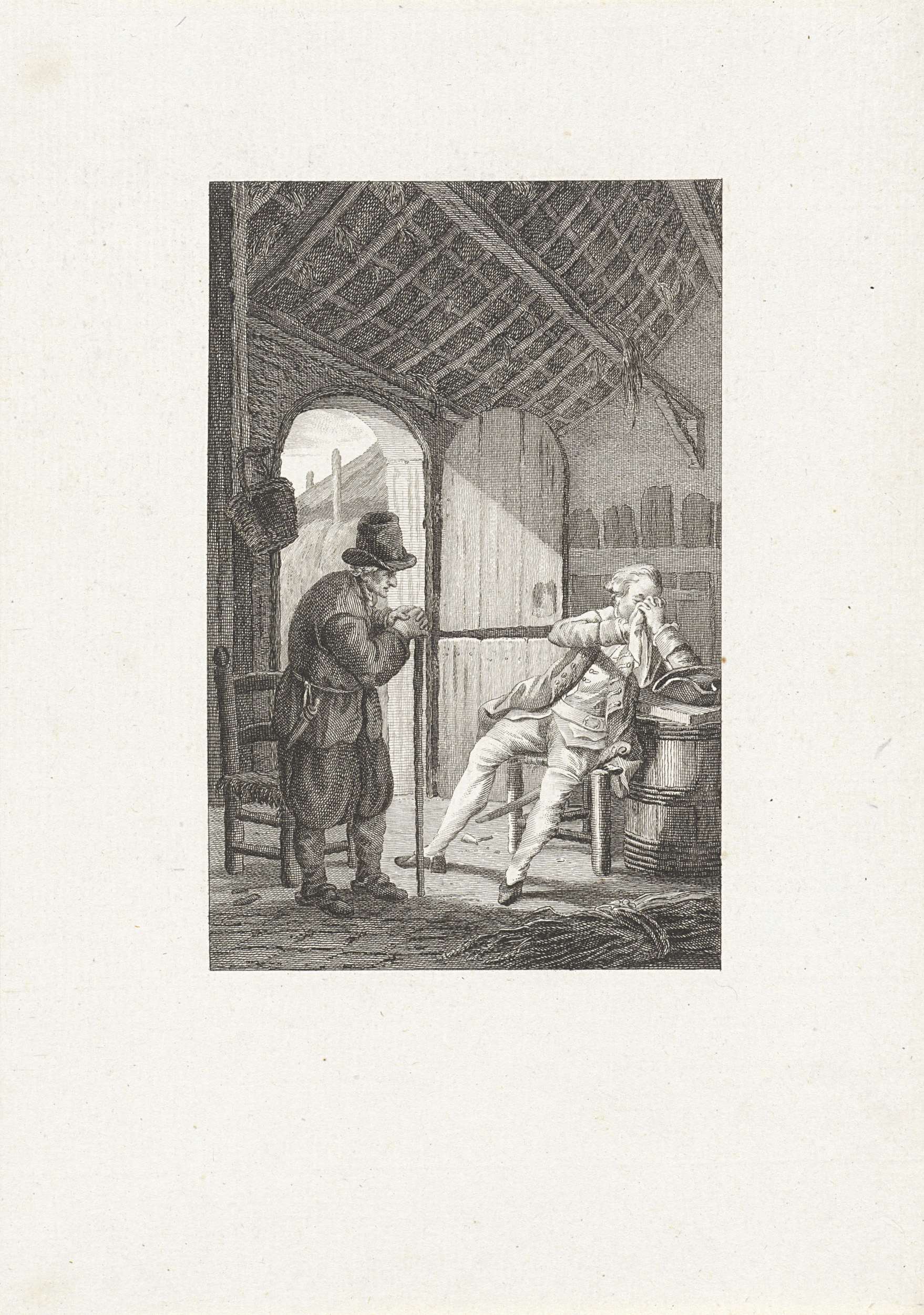 Oude man in gesprek met een heer in een boerderij
