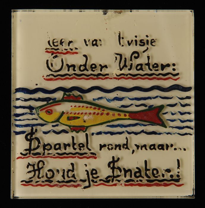 Glazen tegel, handgeschilderd, met vis in water en "...