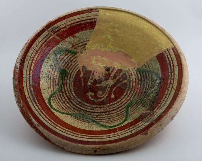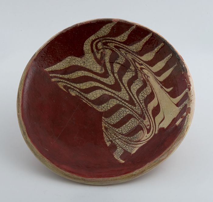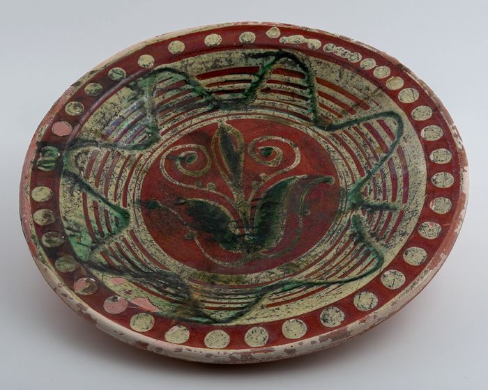 Aardewerk schotel op standvlak, ringeloorbord, gegla...