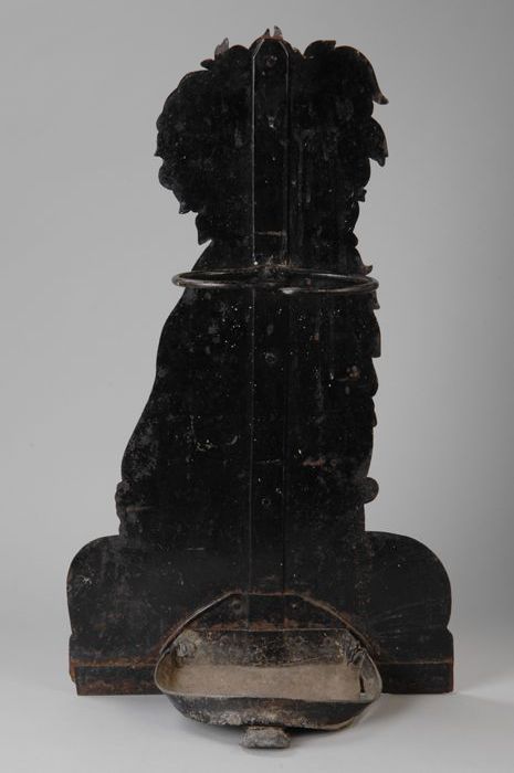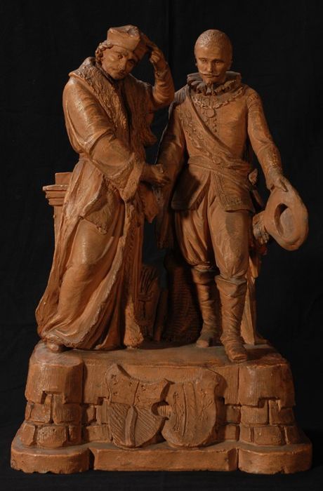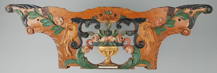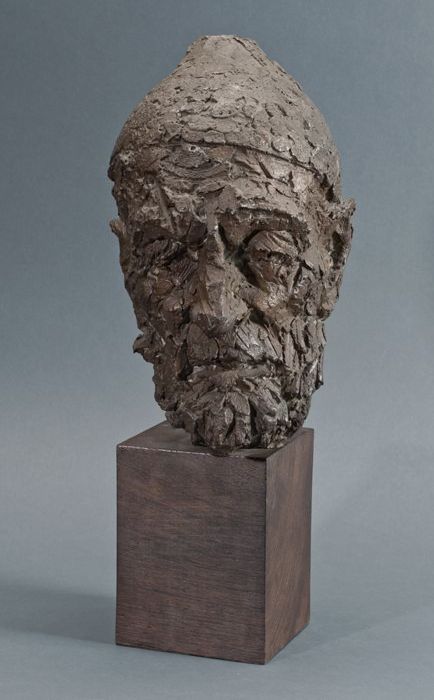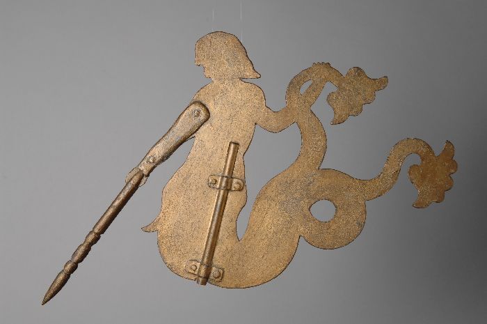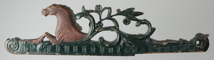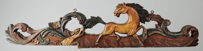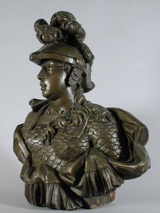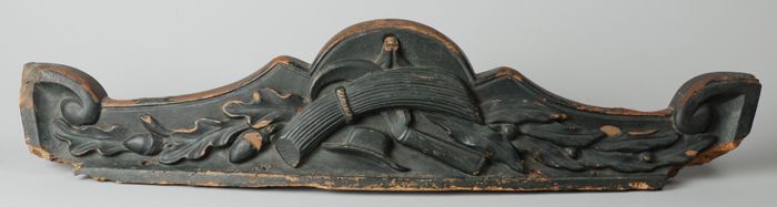Bronskleurig geschilderd houten gevelbeeld van gehel...