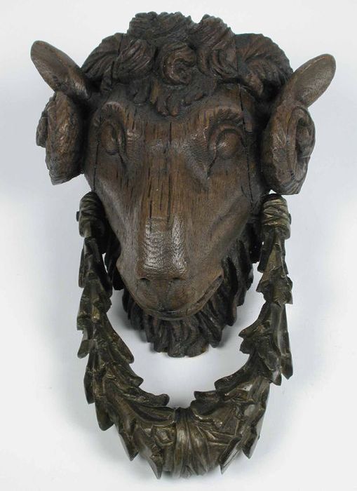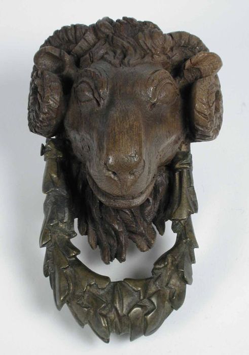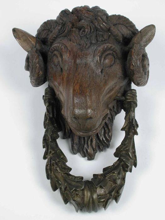 Gedecoreerde deurklopper: ramskop van houtsnijwerk m...