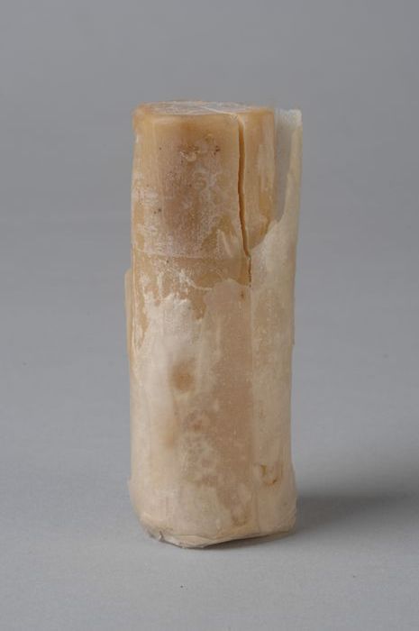 Scheerzeep met blank papieren wikkel, uit linnen zak...