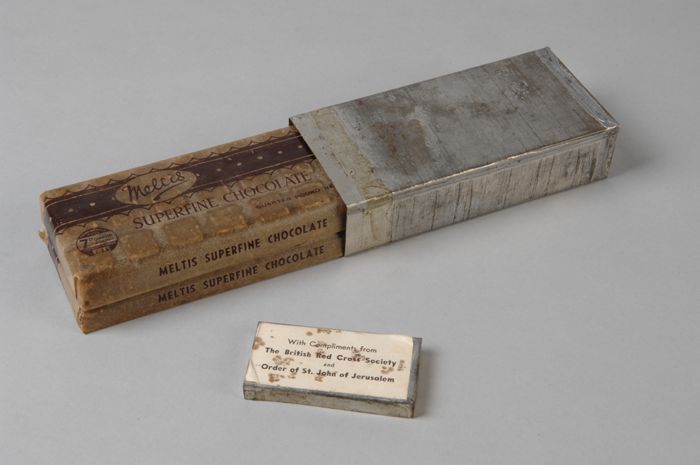 Blikje met twee blokken chocolade, uit linnen zakje ...