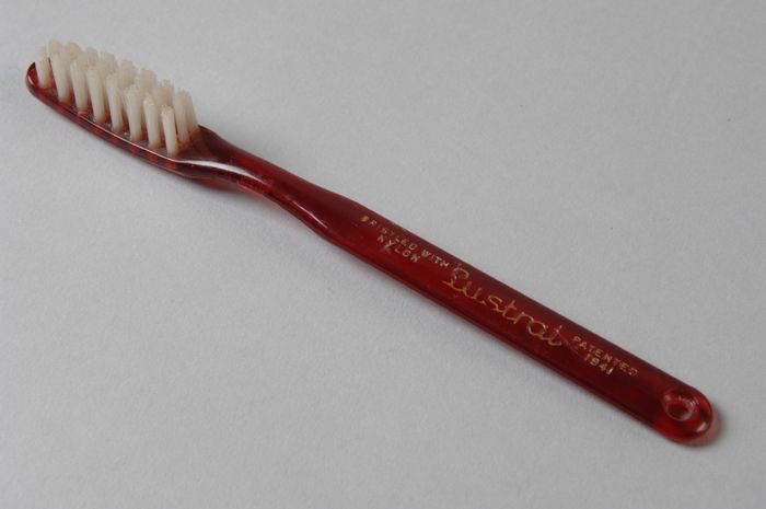 Rode tandenborstel met witte haren, uit linnen zakje...