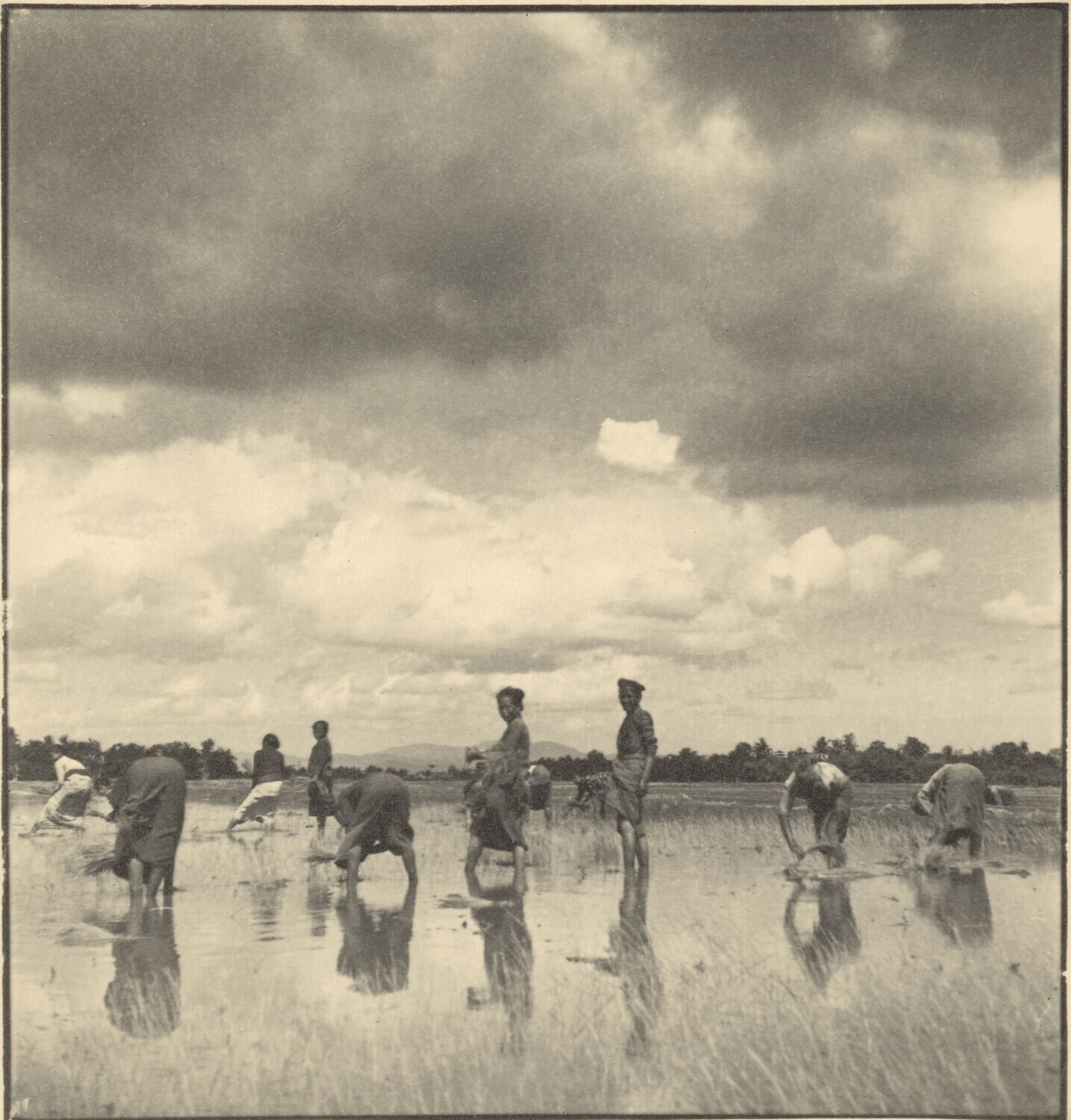 Uitzetten van rijstplantjes in een nat rijstveld