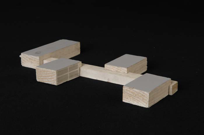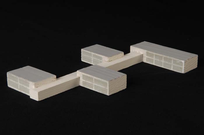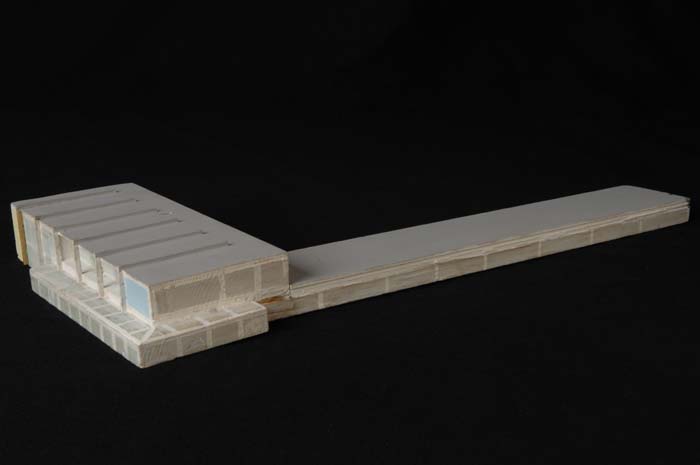 Maquette (1:200) van een L-vormig gebouw van twee ve...