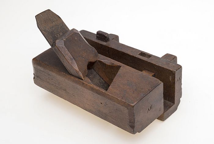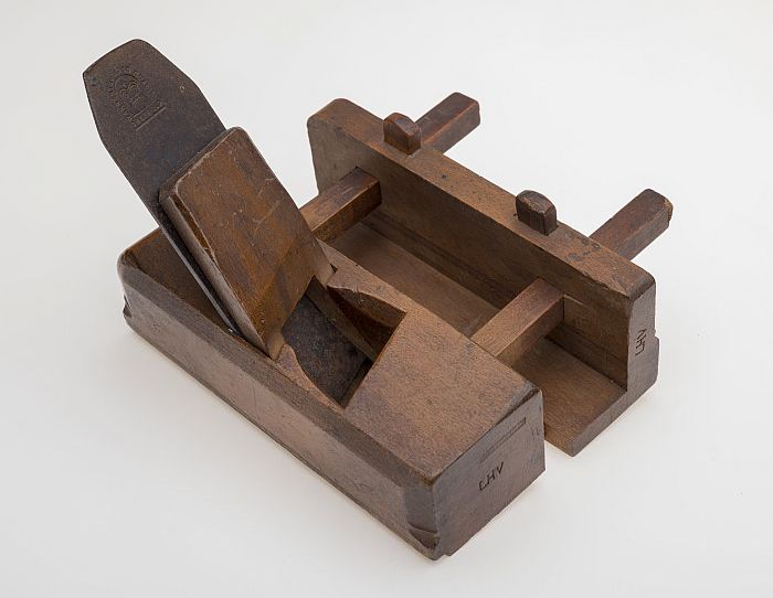 Houten messingschaaf, met eigenaarsinitialen "CVE", ...