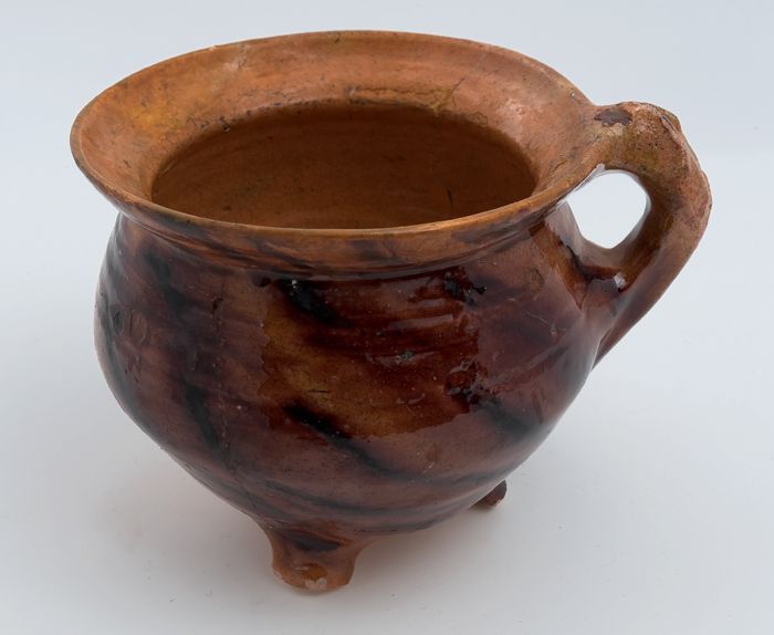 Aardewerk kookkan, witte scherf, in geel en bruin ge...
