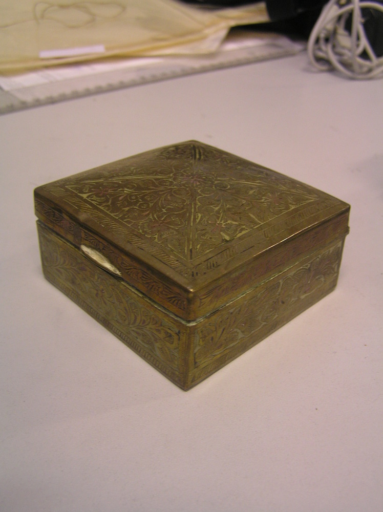 doosje metaal en houd, goudkleurig met versiering