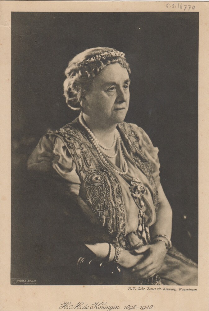 Portretfoto koningin Wilhelmina met tekst H.M. de Ko...