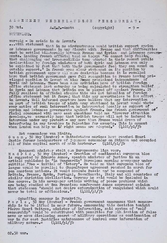 Algemeen Nederlandsch Persbureau, mededelingen, 30 m...