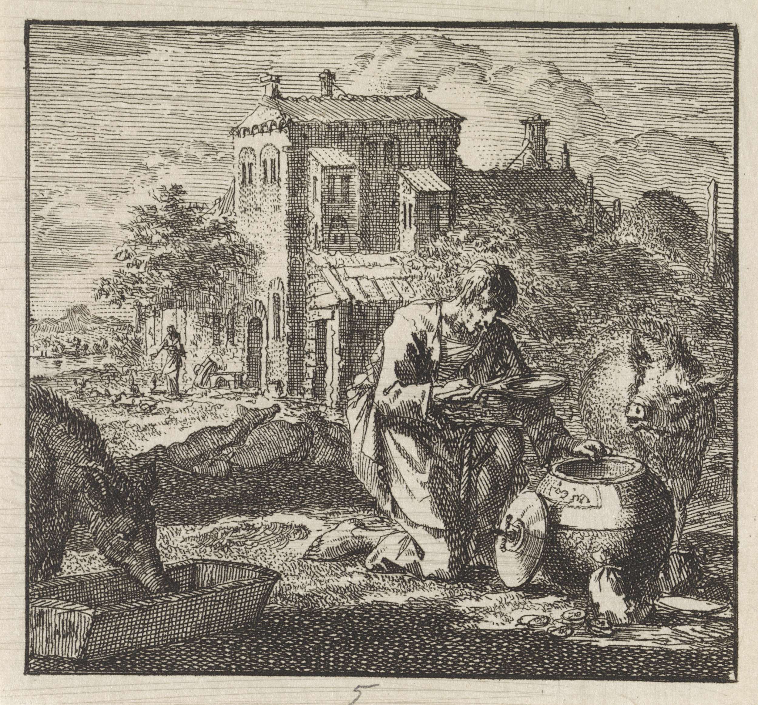 Arme man zit tussen de zwijnen en neemt voedsel uit ...