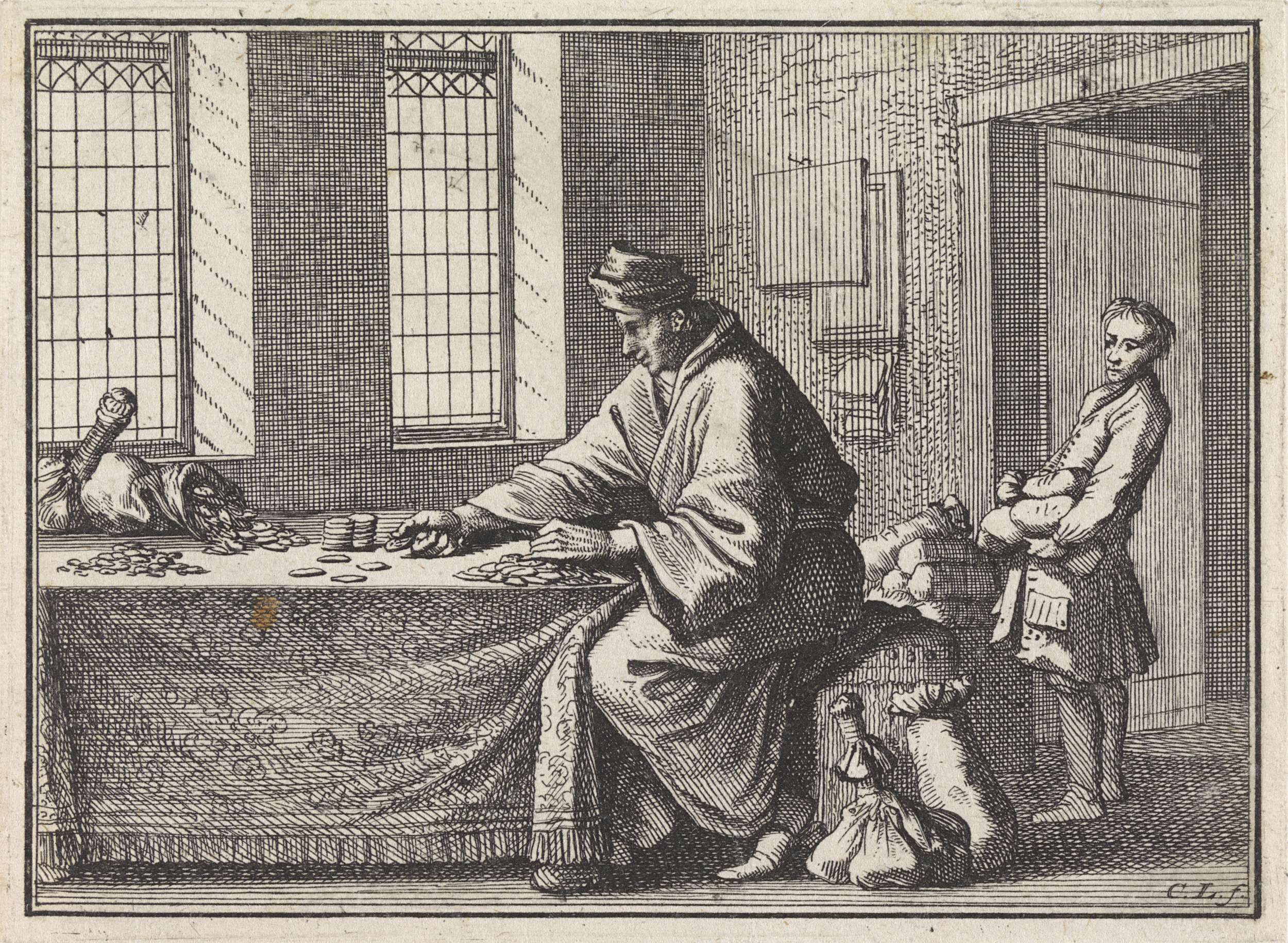 Man telt munten en een jongen brengt hem geldzakken