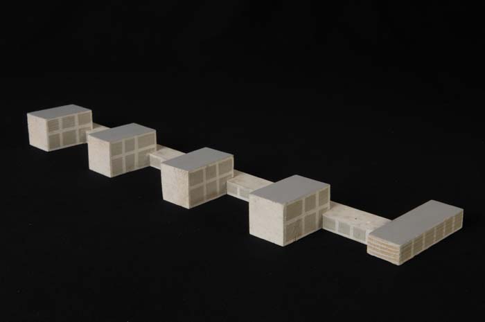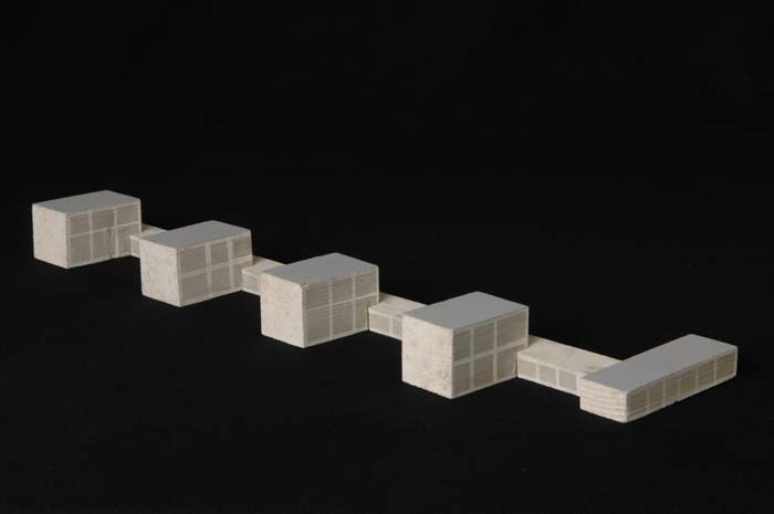 Maquette (1:200) van een vijf met elkaar verbonden g...