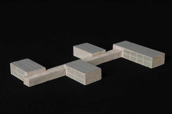 Maquette (1:200) van vier met elkaar verbonden gebou...