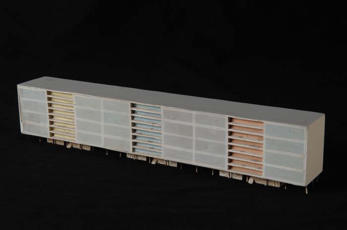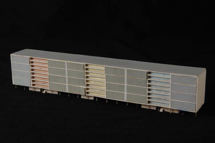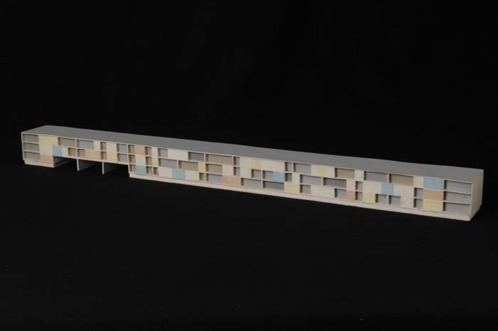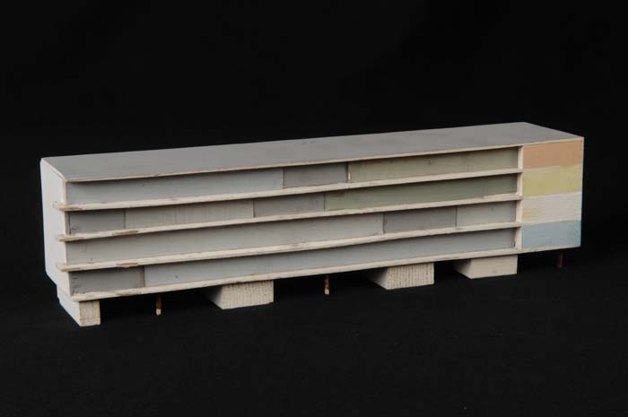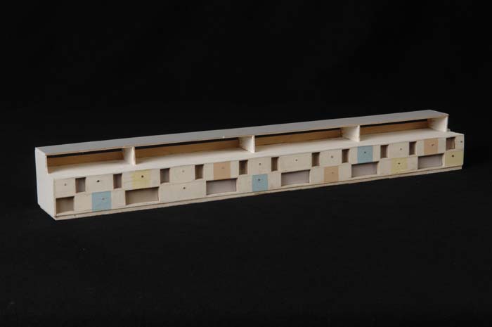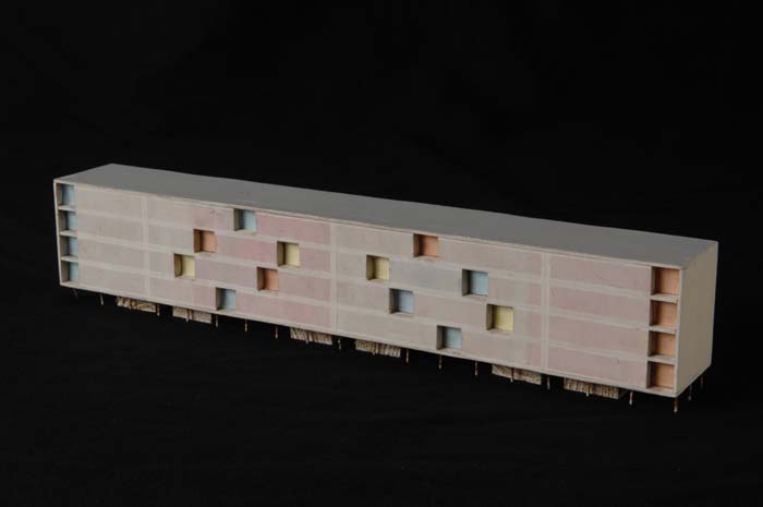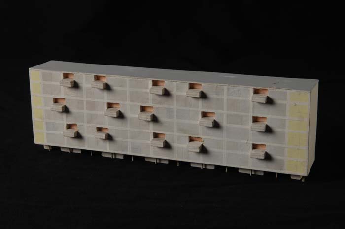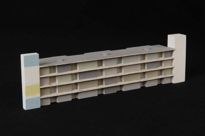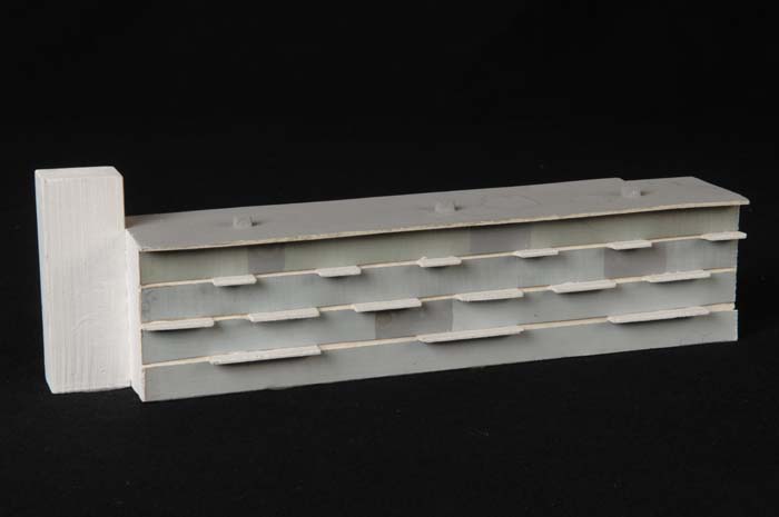 Maquette (1:200) van een galerijflat van vier verdie...