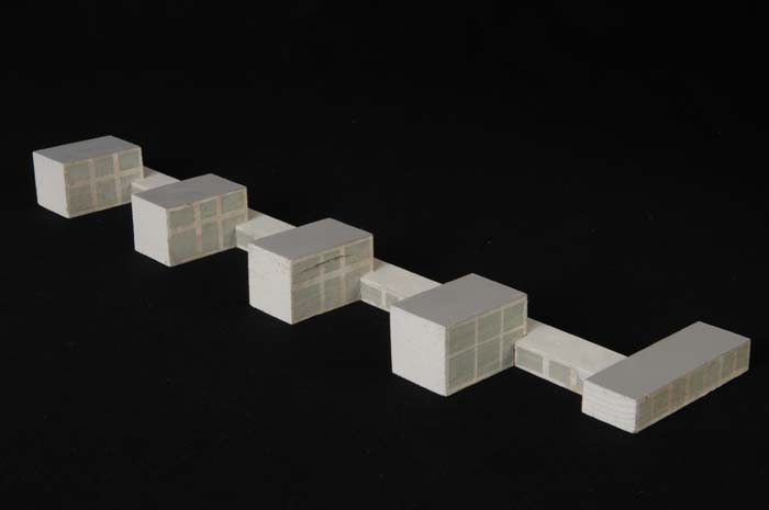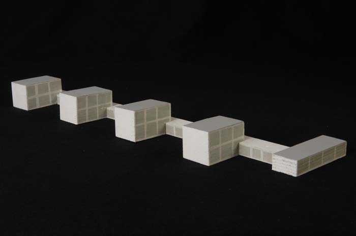 Maquette (1:200) van vijf met elkaar verbonden gebou...