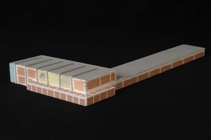 Maquette (1:200) van een L-vormig gebouw van twee ve...