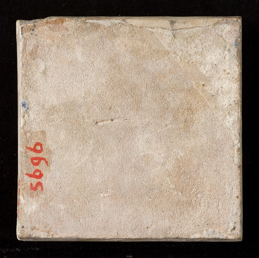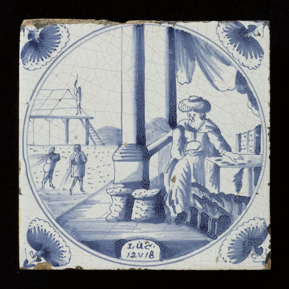 Tegel van keramiek met tinglazuur, voorstellende: De...