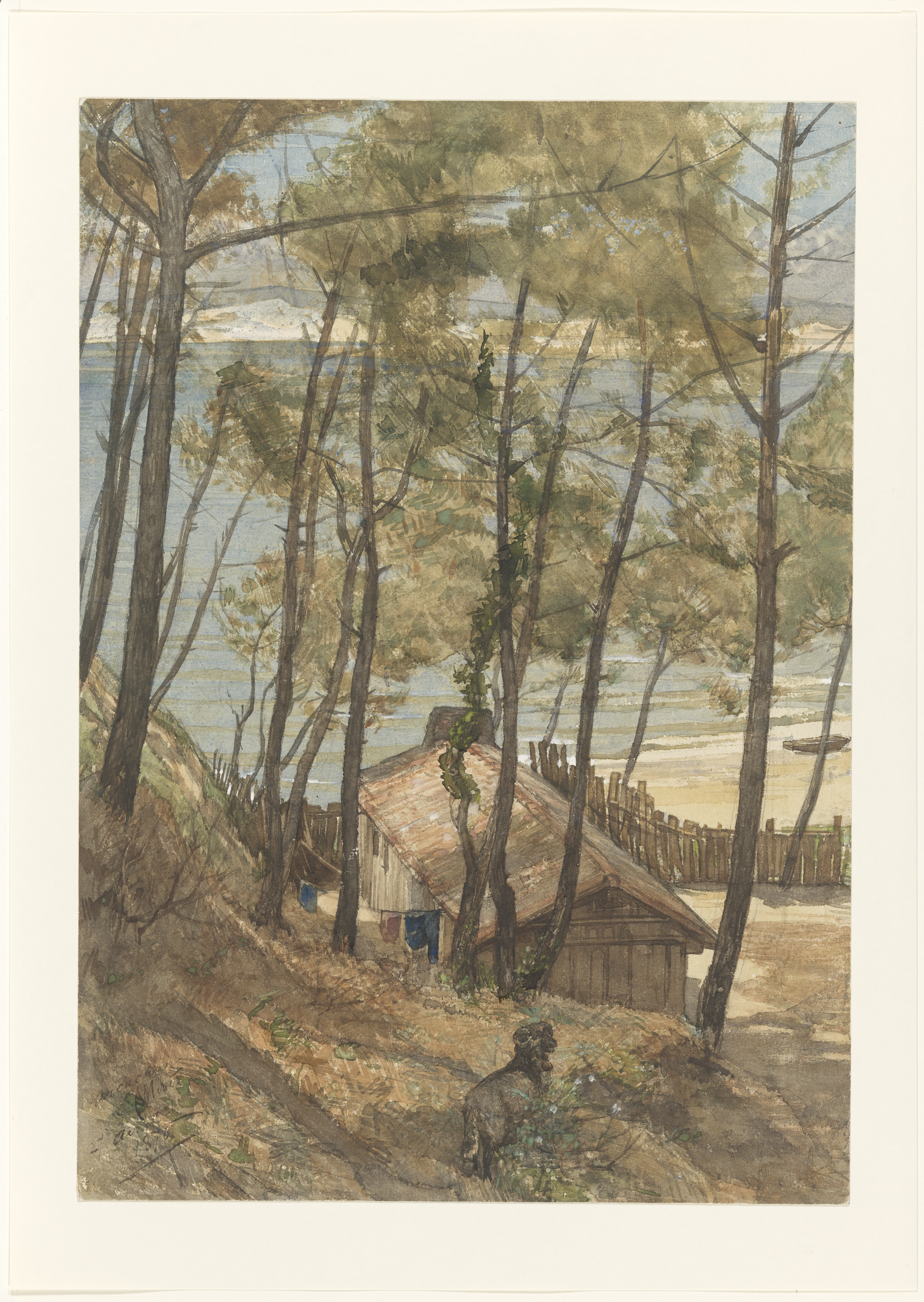 Gezicht vanaf een heuvel op een huisje aan de golf v...