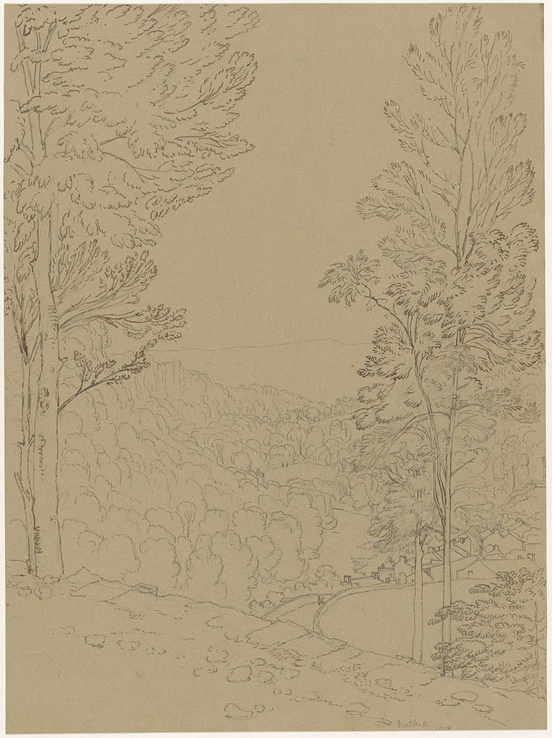 Landschap met een ruiter en koeien voor een boomgroep