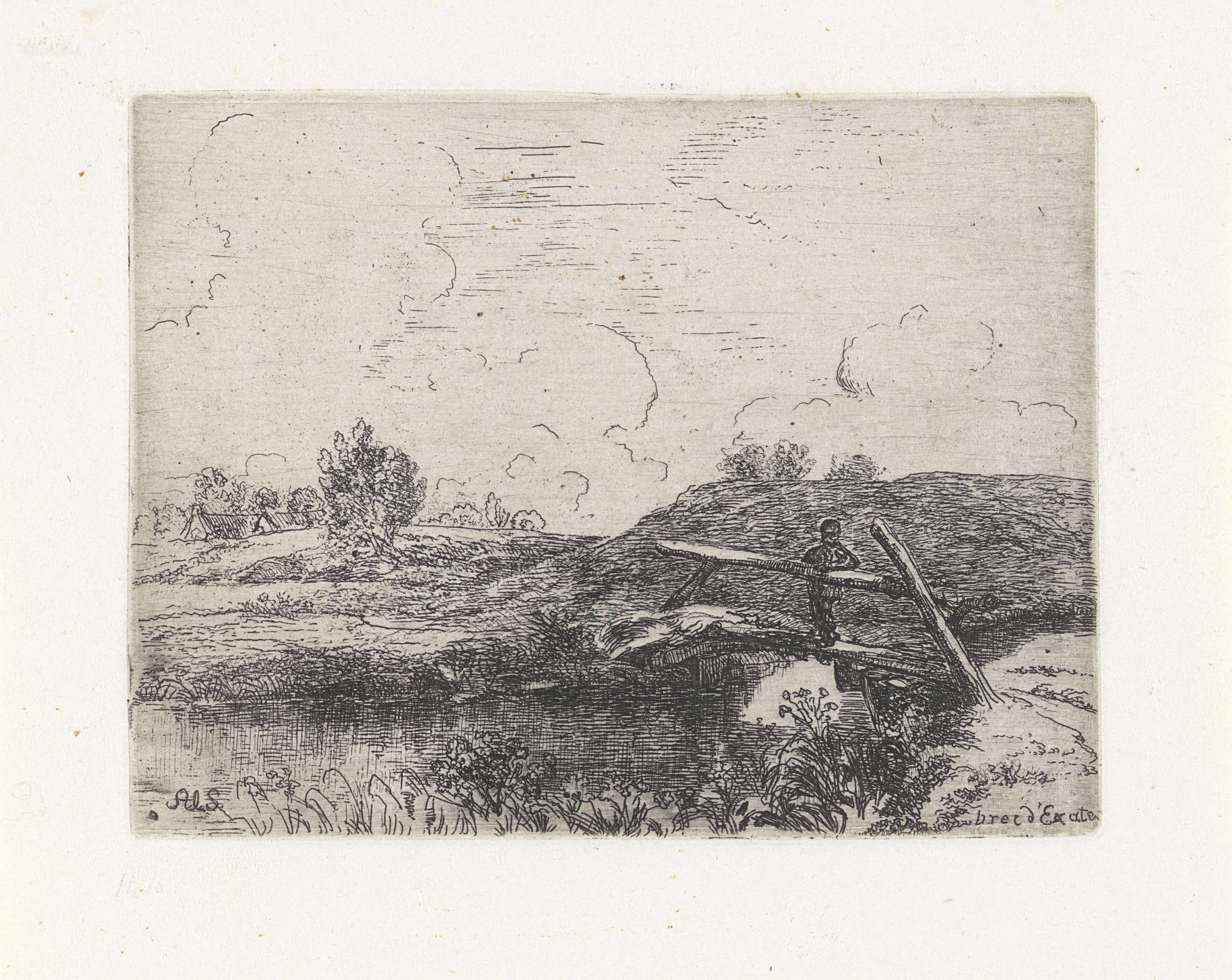 Waterrijk landschap met figuur op een houten bruggetje