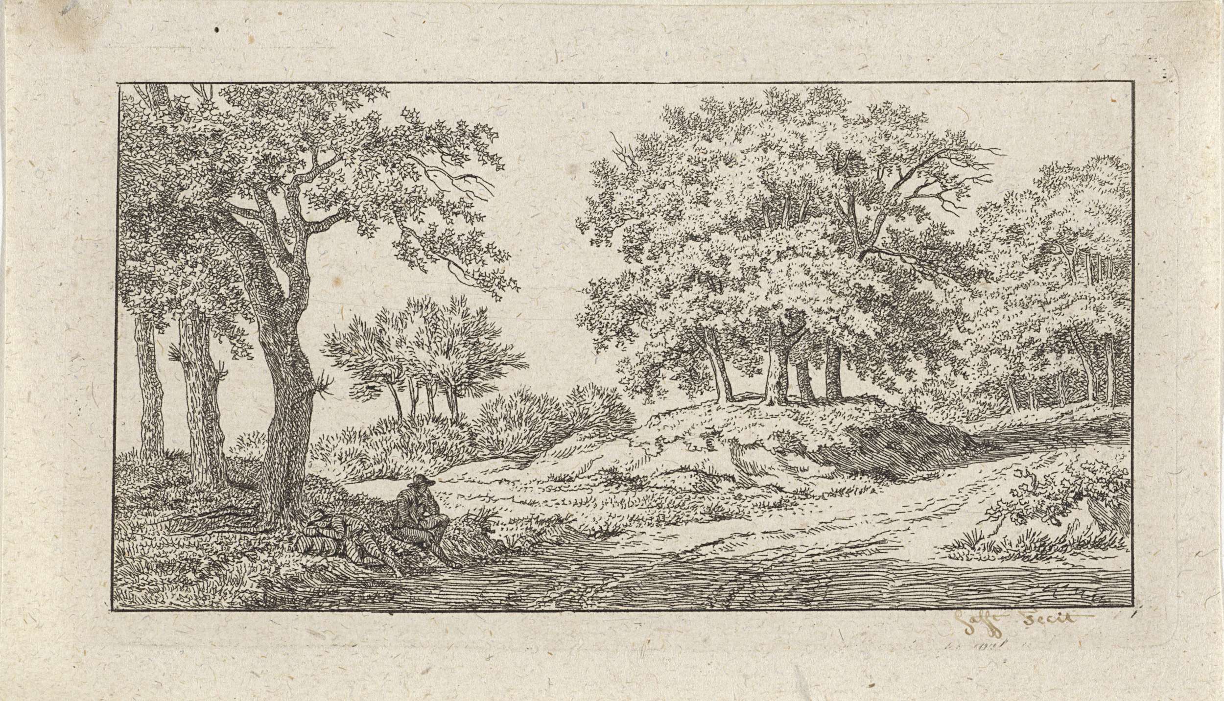Twee rustende figuren naast een bospad