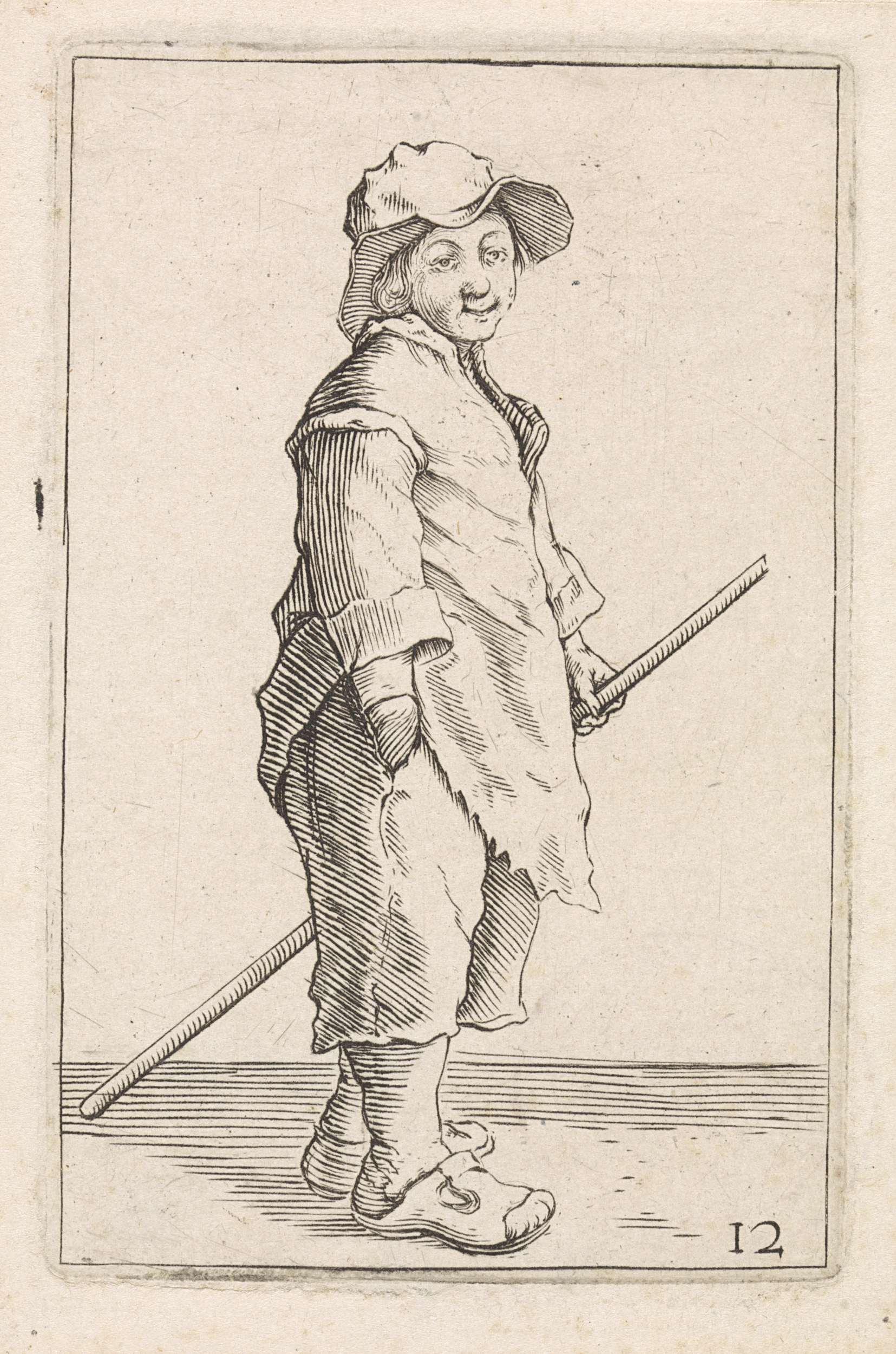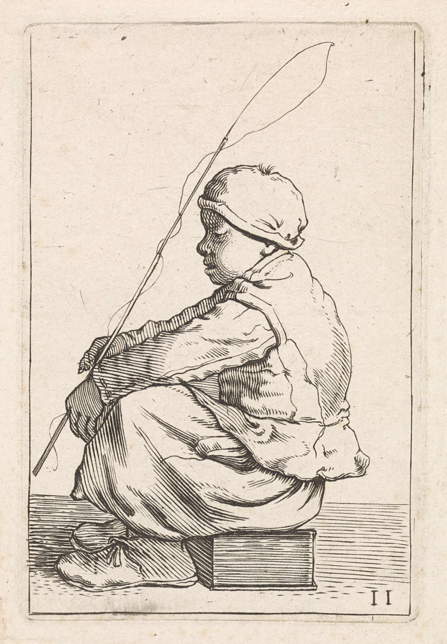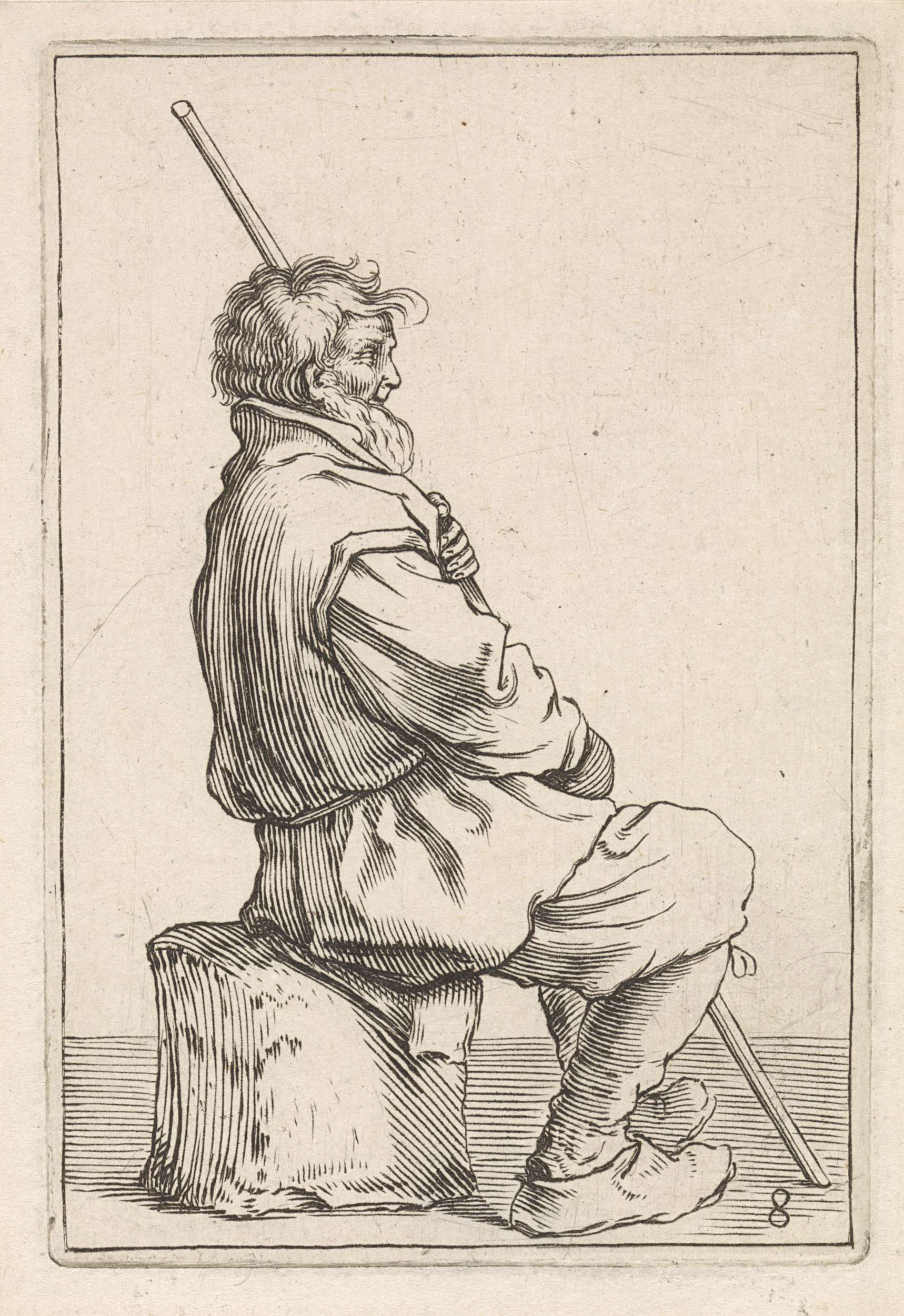 Zittende man met lange stok