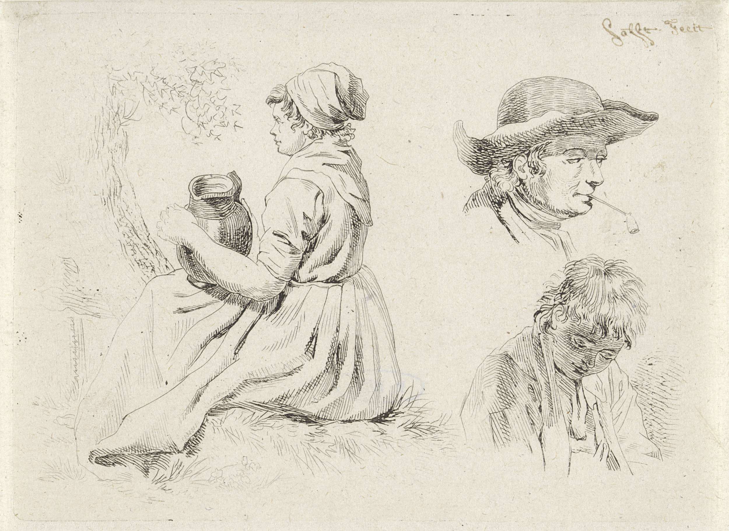 Zittende vrouw met schenkkan, portret van een man me...