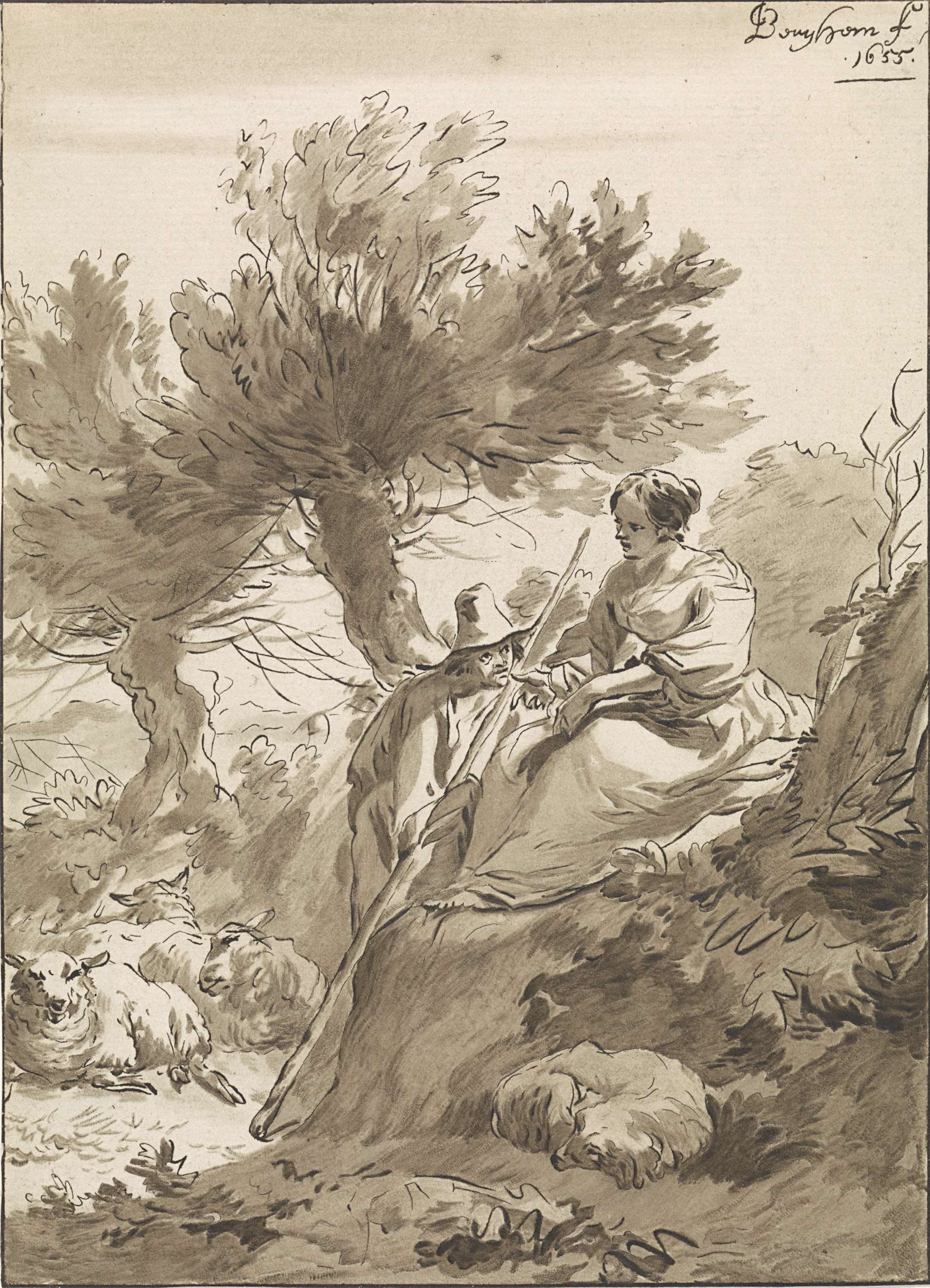 Landschap met herder en herderin en hun schapen