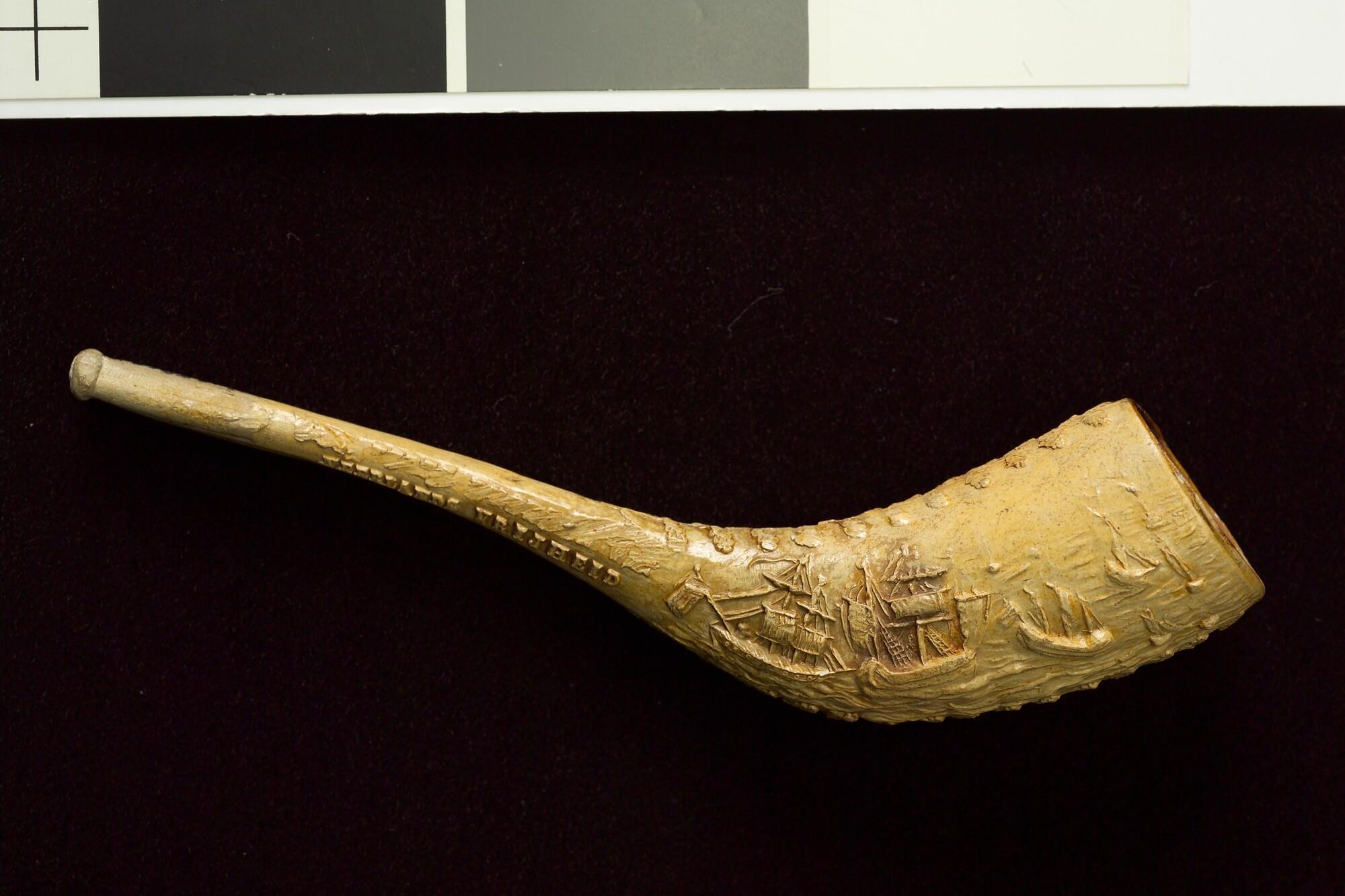 Rookpijp, aardewerk, met voorstelling van de bestorm...