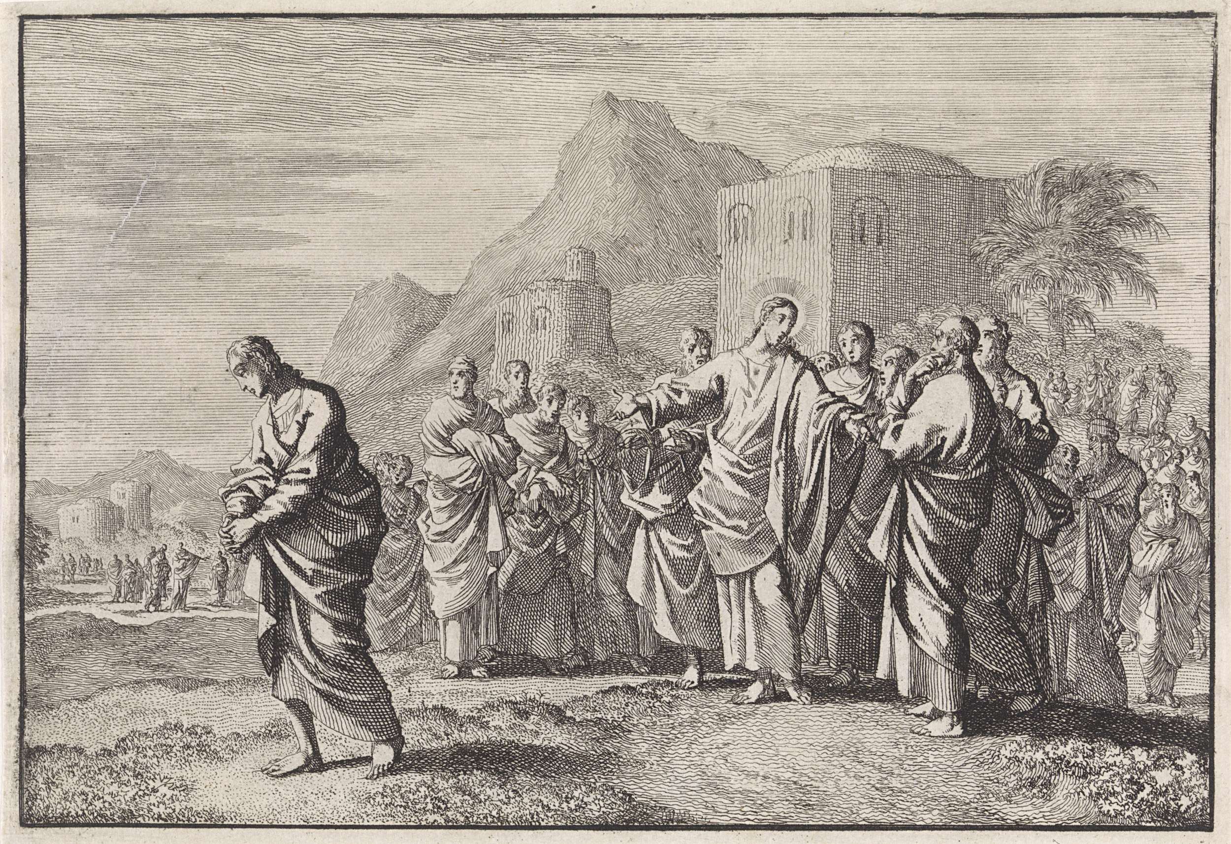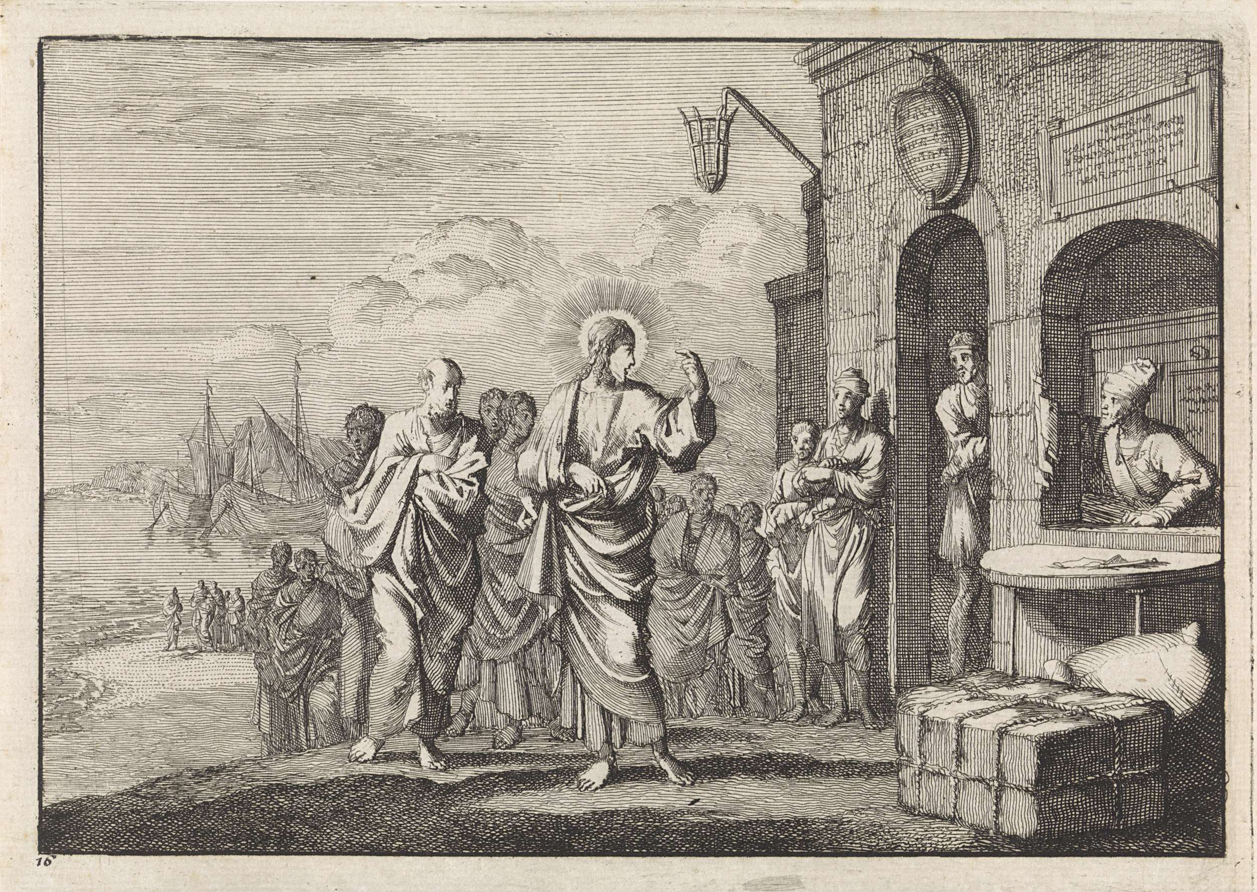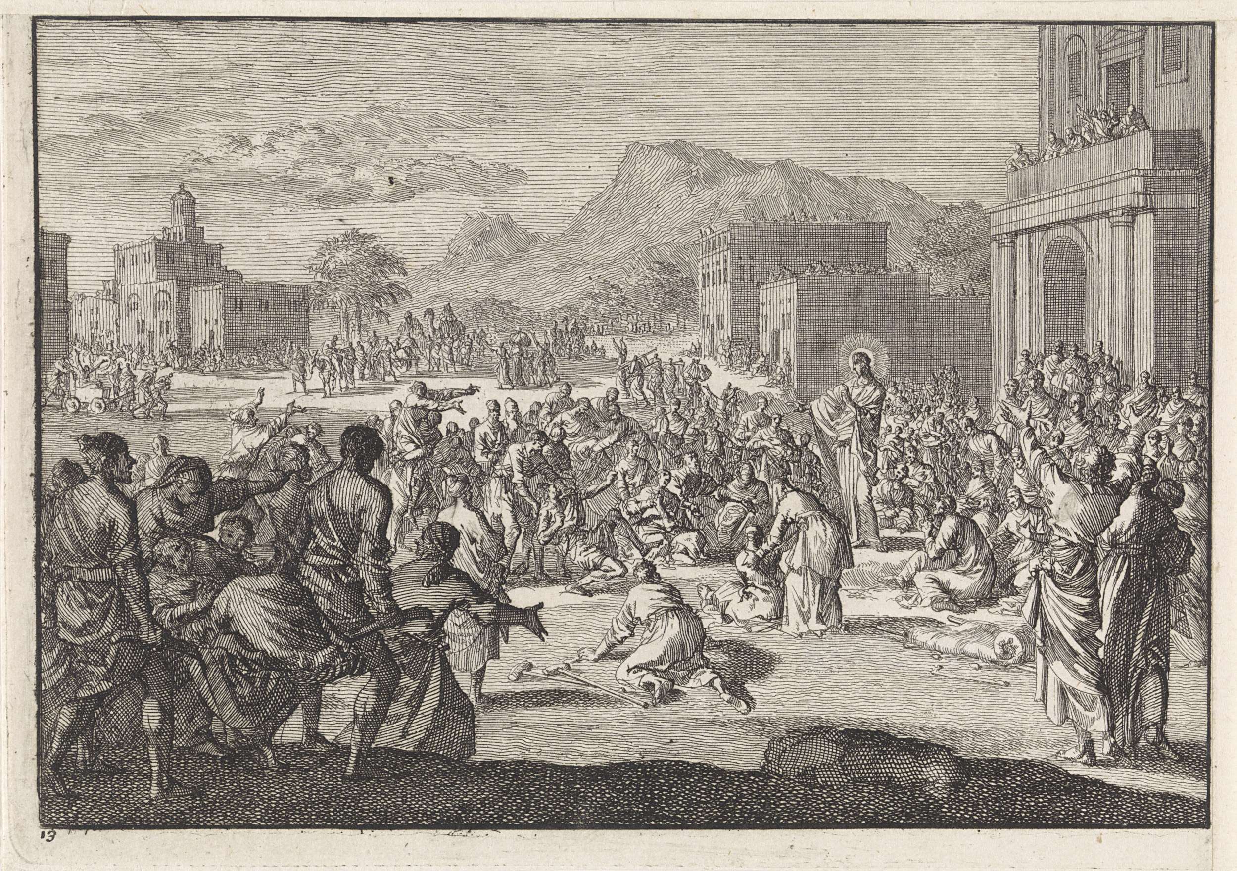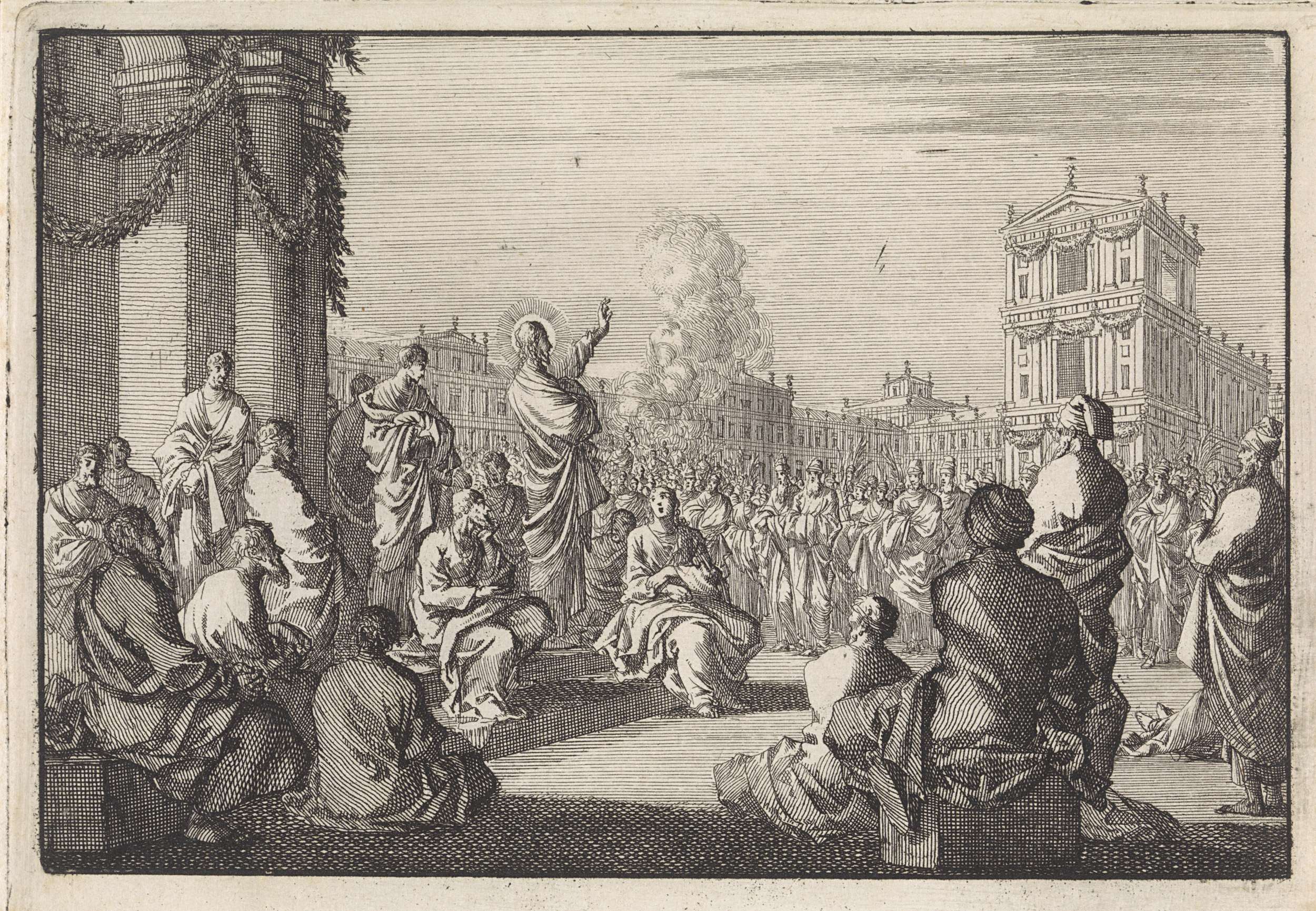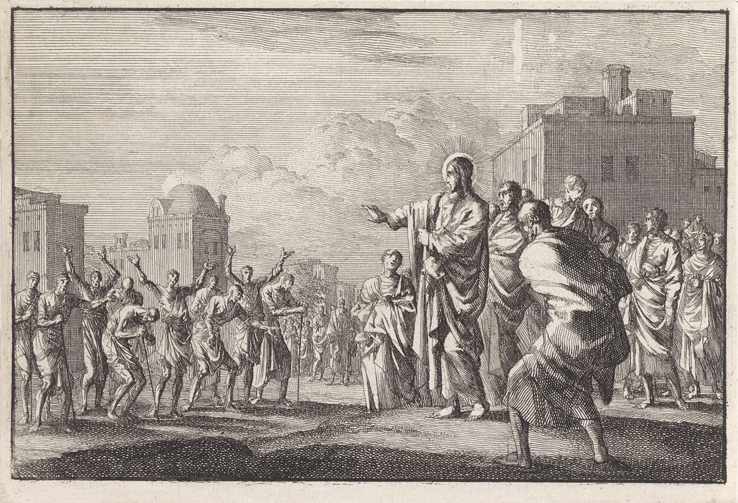 Christus spreekt tot een menigte op een plein.