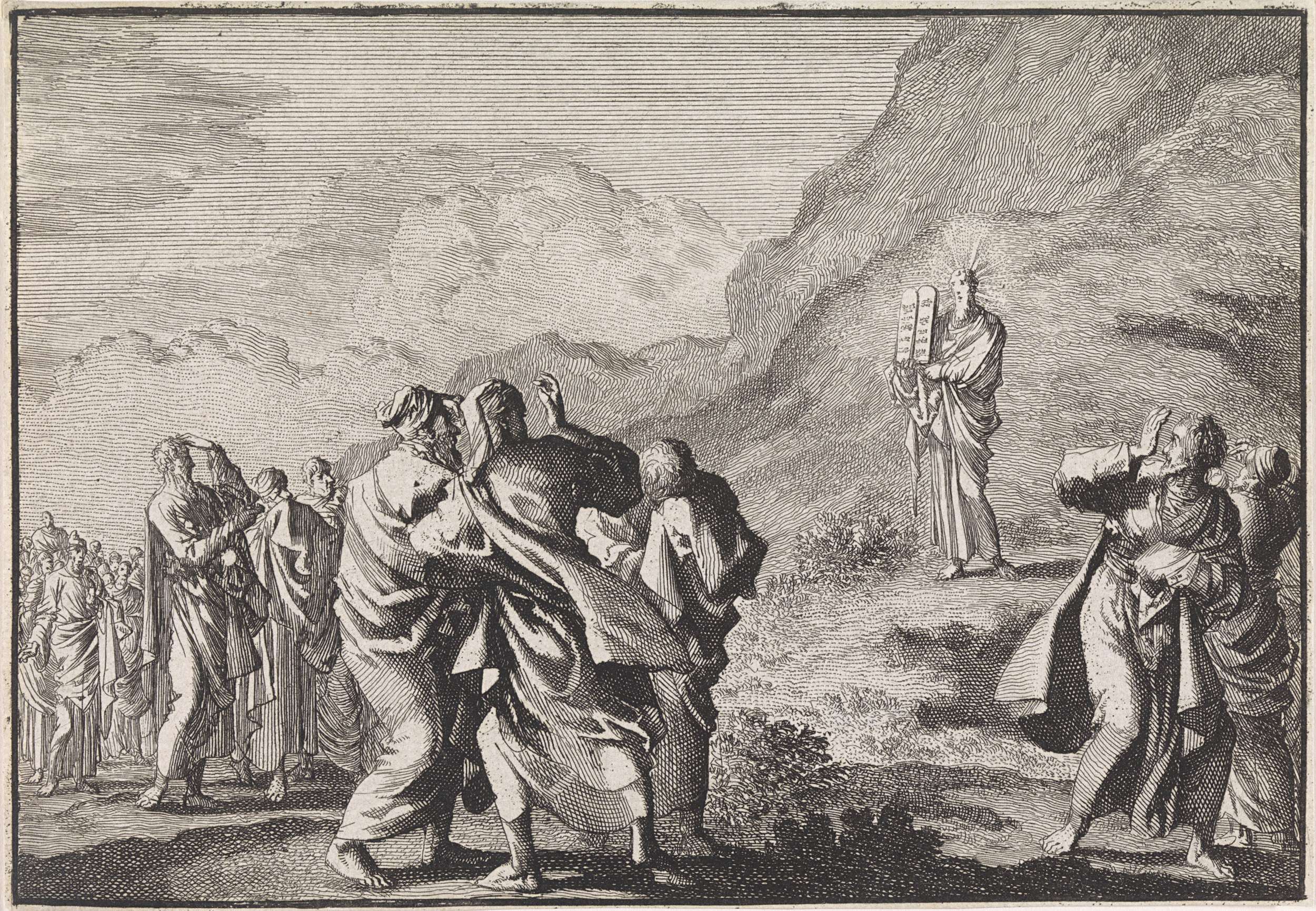 Mozes ontvangt de wetstafelen en toont ze aan het volk