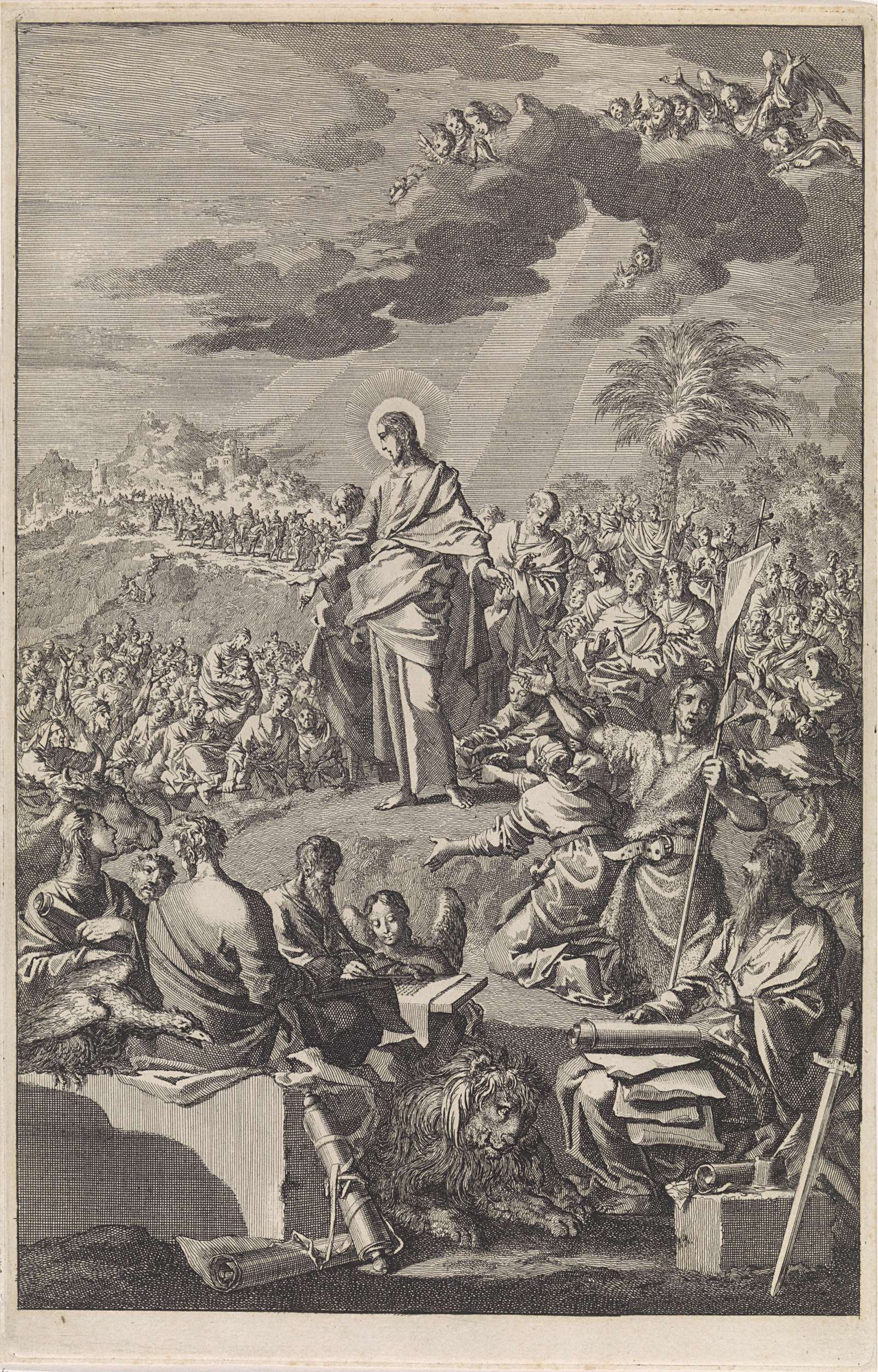 Bergrede met Christus en de vier evangelisten
