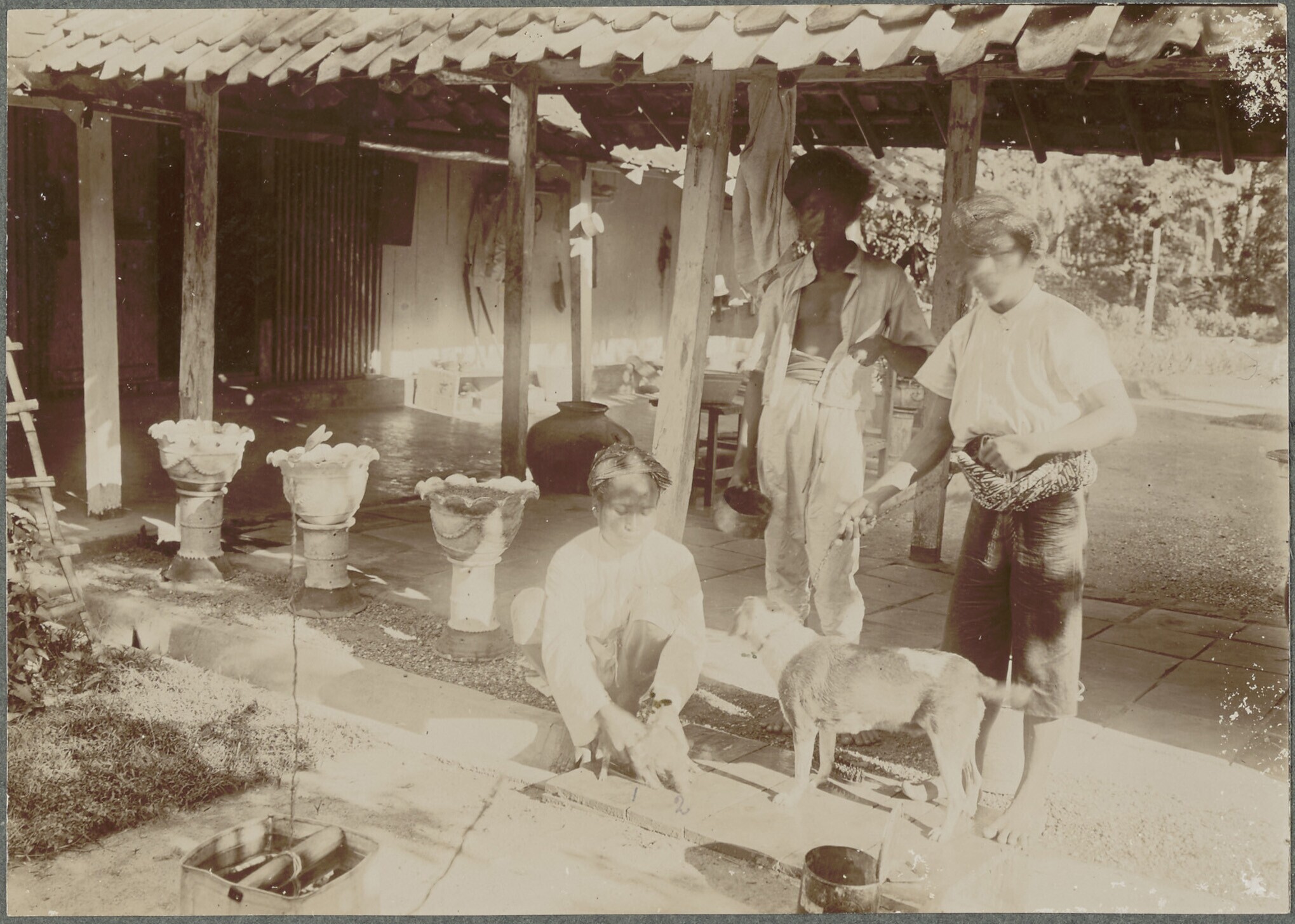 Huisjongens in Malo met twee jonge zwijnen en een hond