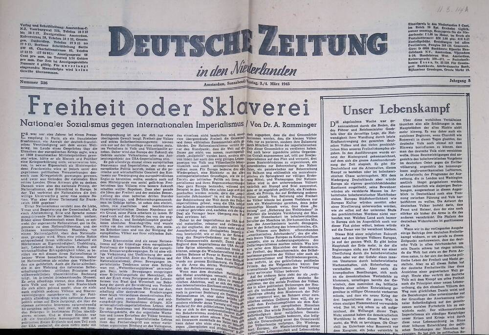 Deutsche Zeitung in den Niederlanden. 3/4 maart 1945.