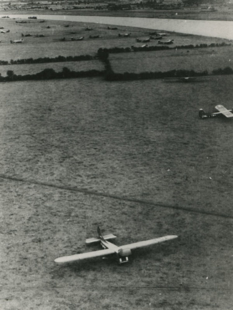 Luchtfoto low oblique van veld met gelande Waco CG-4...