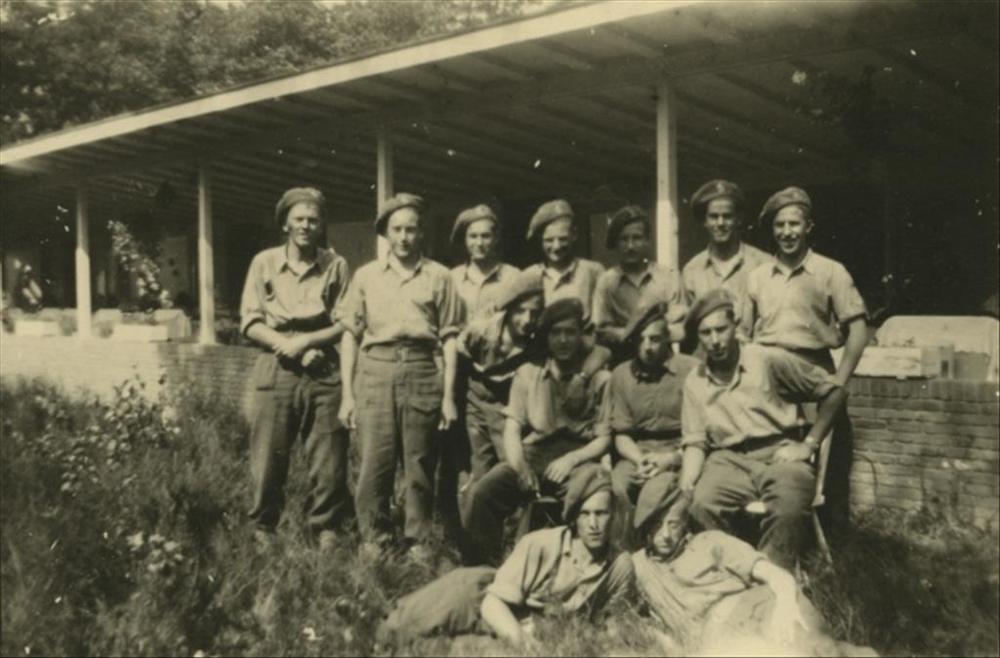 groepsfoto van 13 Britse en Canadese militairen, Dek...