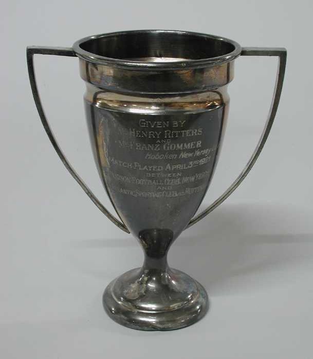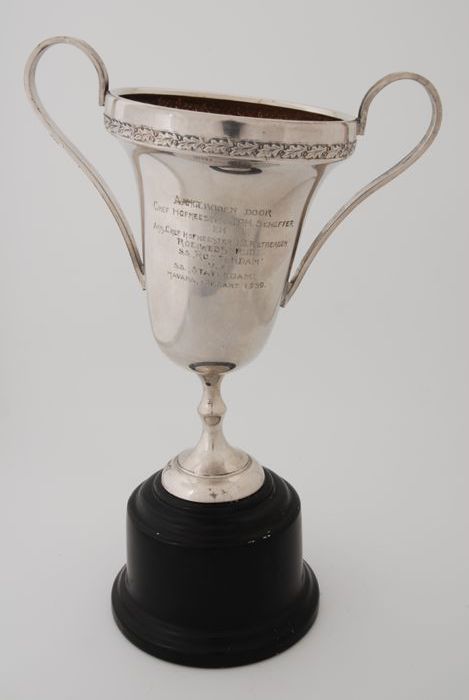 Verzilverde (?) prijsbeker voetbalwedstrijd, met twe...