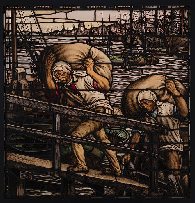 Glas-in-lood met afbeelding zakkendragers die zakken...