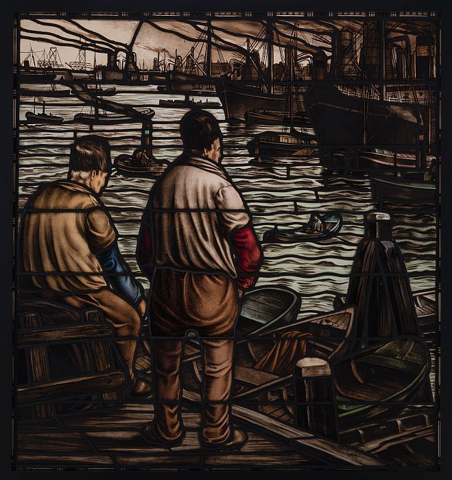 Glas-in-lood met afbeelding bootwerkers die koren in...