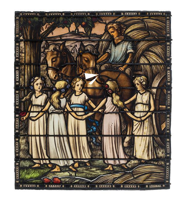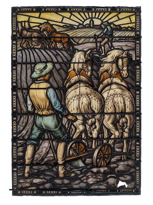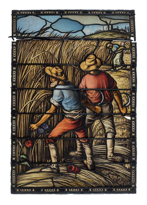 Glas-in-lood met het oogsten, twee maaiers en een ar...