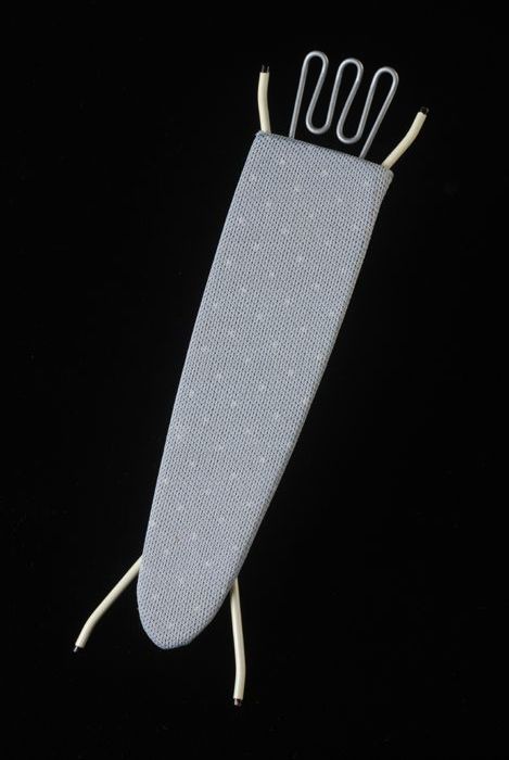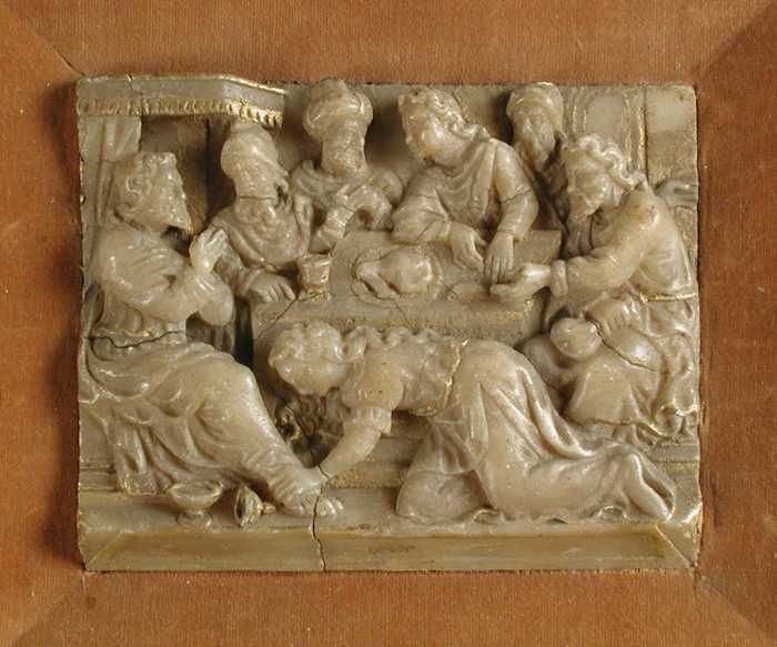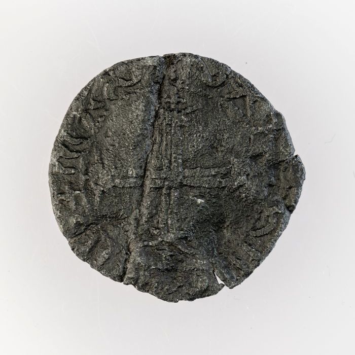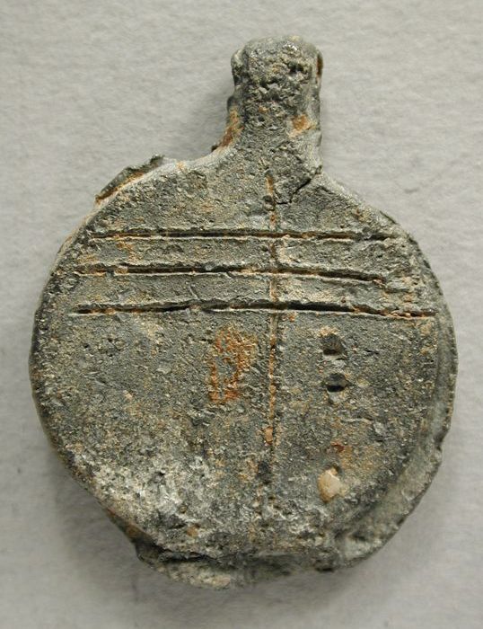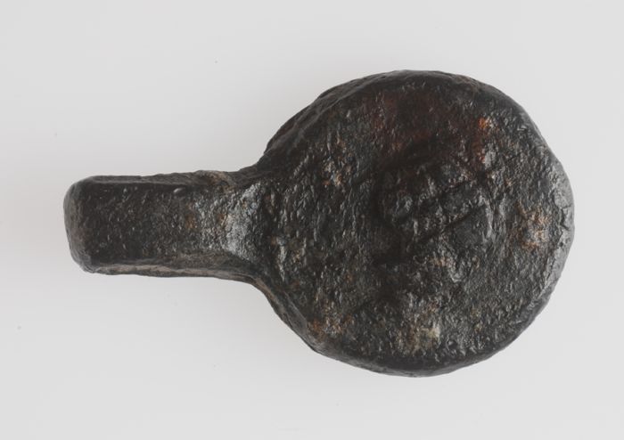 Ronde koperkleurige medaille met in reliëf twee voet...