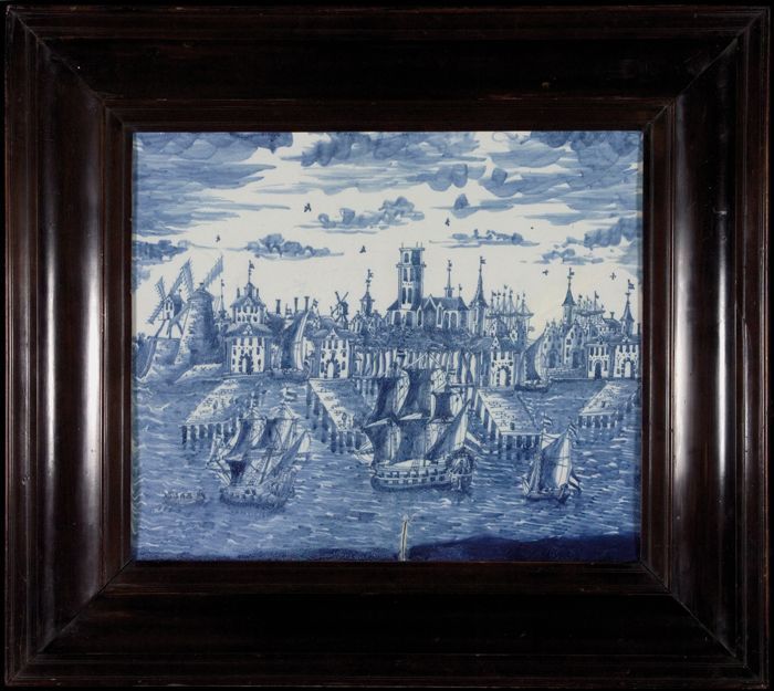 Blauwe rechthoekige aardewerk plaque in zwarte antie...