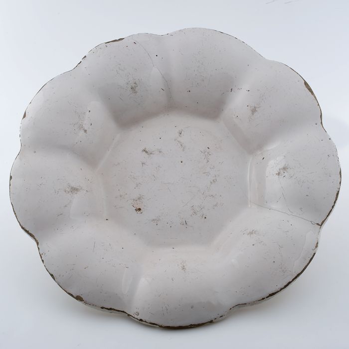 Aardewerk plooischotel, geheel wit geglazuurd, op st...