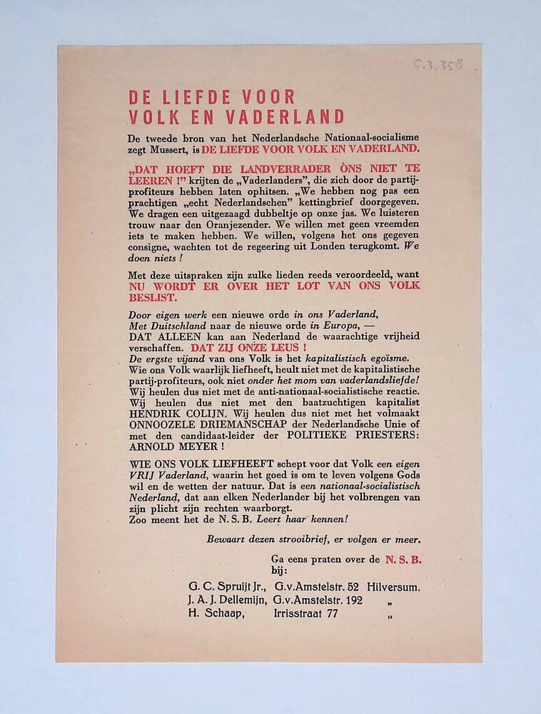 NSB Pamflet De liefde voor volk en vaderland